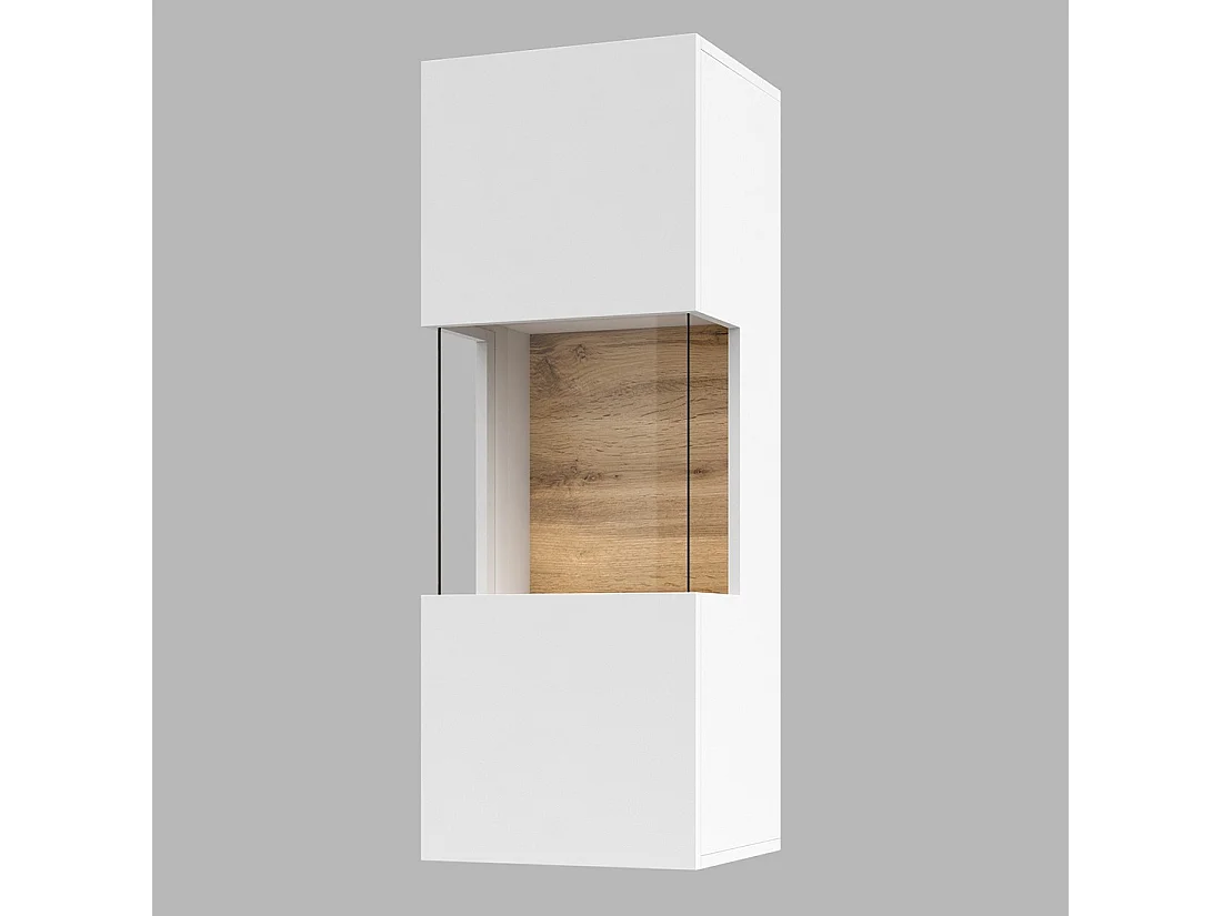 Petite vitrine suspendue 1 porte partiellement vitrée collection EVA. Couleur blanc mat et chêne.
