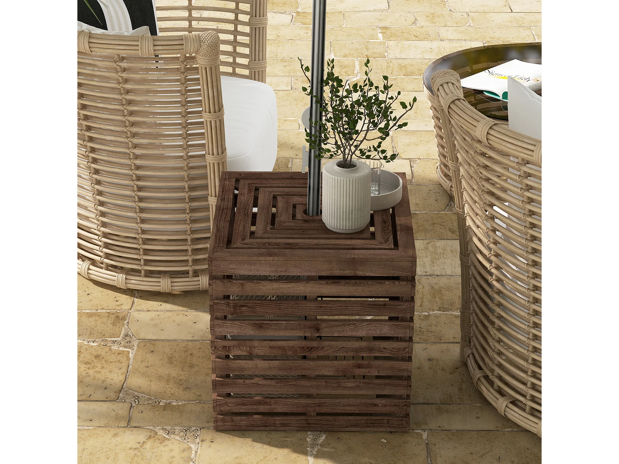 Pied de parasol coffre de rangement table basse 3 en 1 bois de sapin
