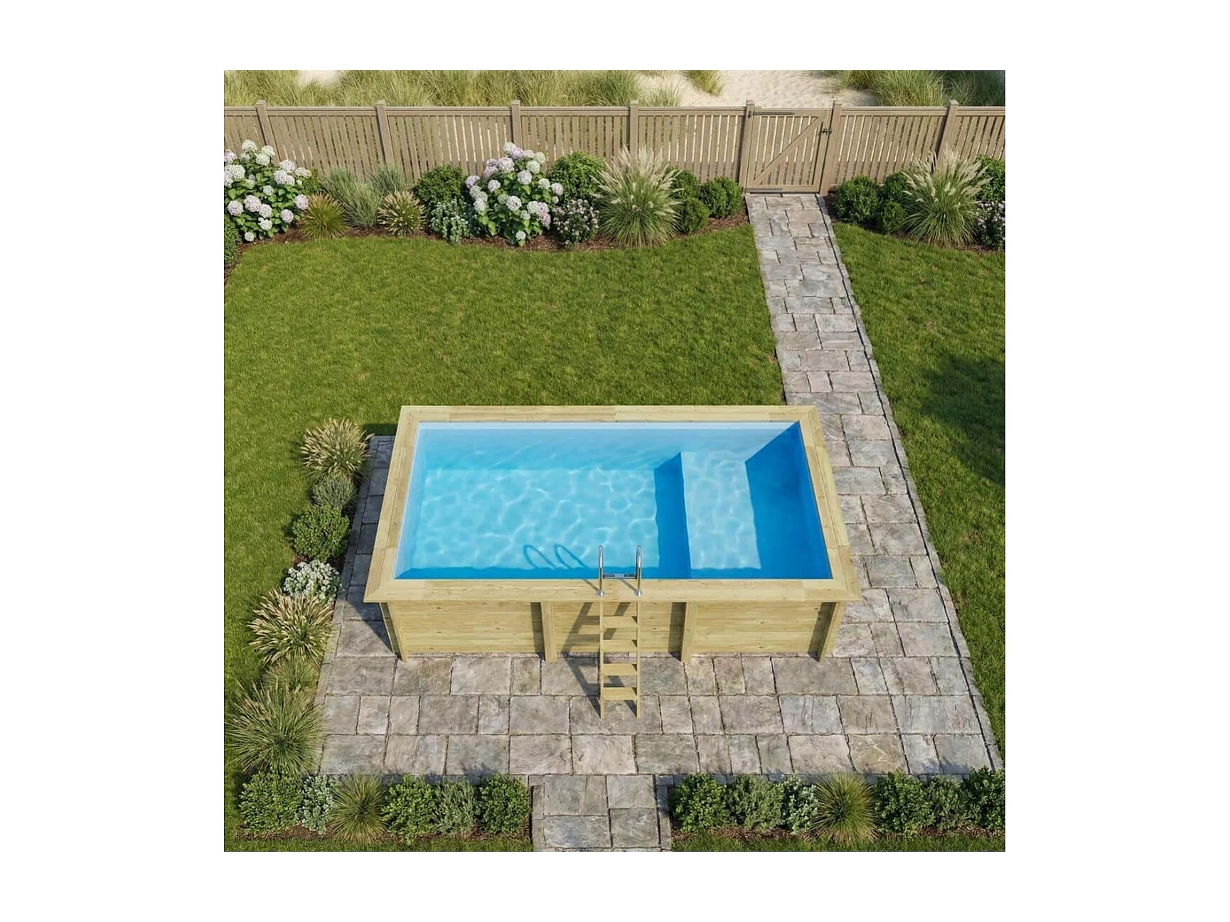 Piscine en bois AQUA 6.1 x 2.85 - H.1.31 m avec plage, bleu pâle, fixations à visser - BAS7307OSPL+PLA307 - ALTANKA