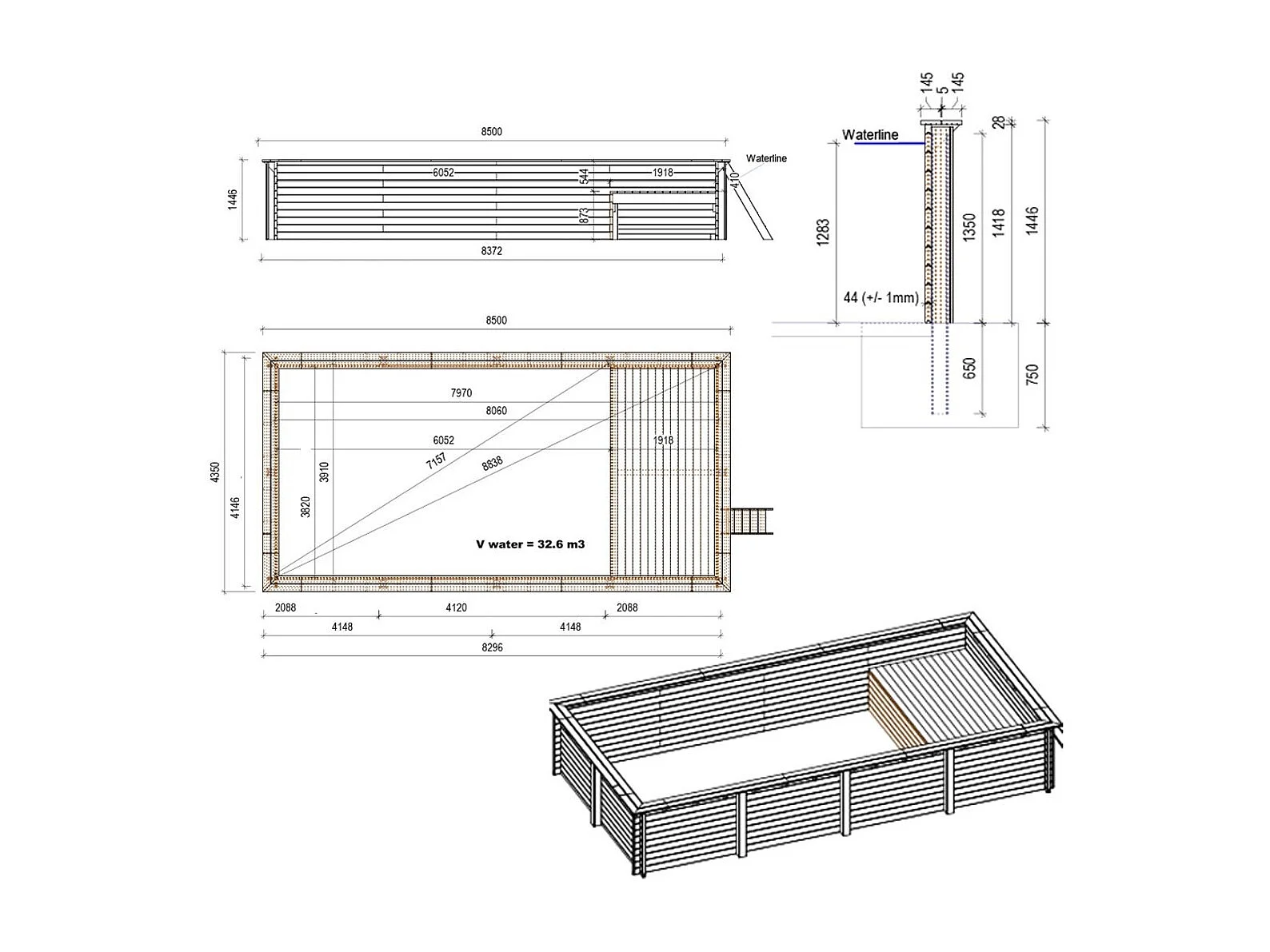 Piscine en bois AQUA 8.5 x 4.35 - H.1.45 m avec plage, bleu pâle, cadre en métal - sans dalle - BAS7309OSPU+PLA309 - ALTANKA