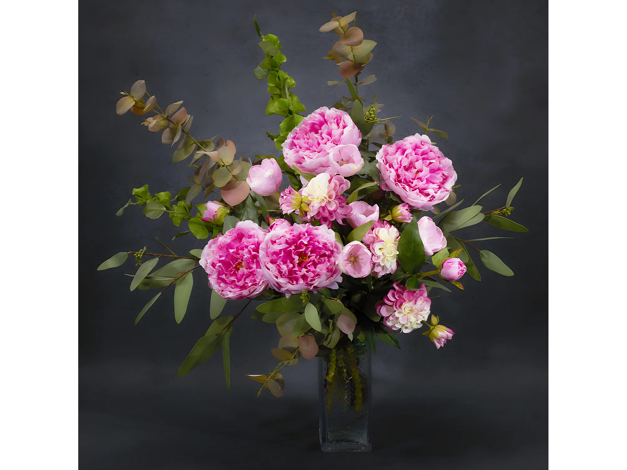 Composition Florale & Vase "3 Pivoines" Verre 25cm Transparent