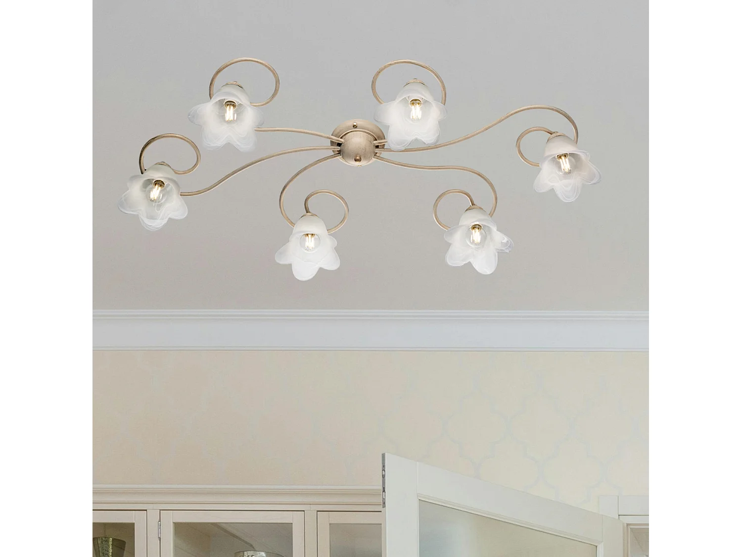 Plafonnier Alice ivoire, déco or antique, verre albâtre d.14, 6 lumières 99x50 cm, ambiance douce et chic