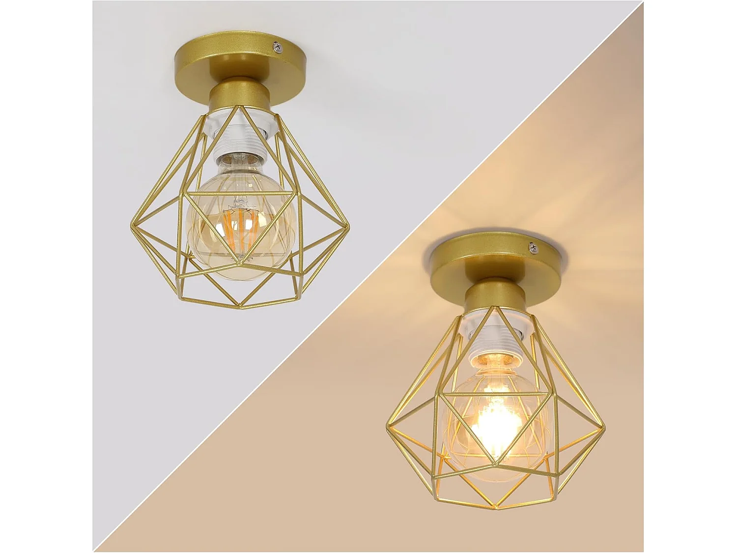 Plafonnier Industriel Vintage E27 Lustre Luminaire Métal Cage Suspension Rétro éclairage Plafond en Fer Noir pour Salon Cuisine Chambre Bar Or 2PC
