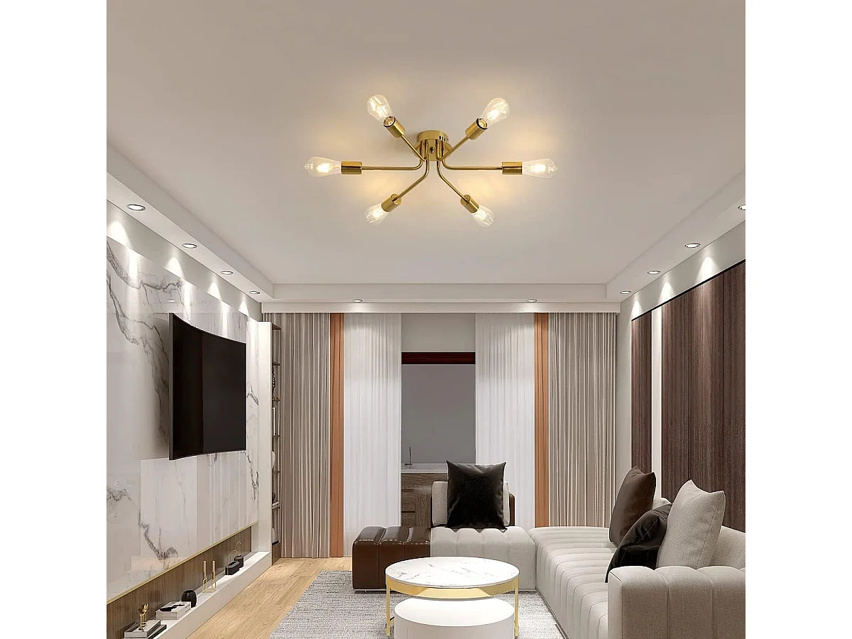 Plafonnier LED Moderne,E27 Lustre Vintage Industriel,6 Lumières Luminaire Suspension Métal pour Salon,Chambre,Salle à Manger,Balcon,Bureau (Doré)