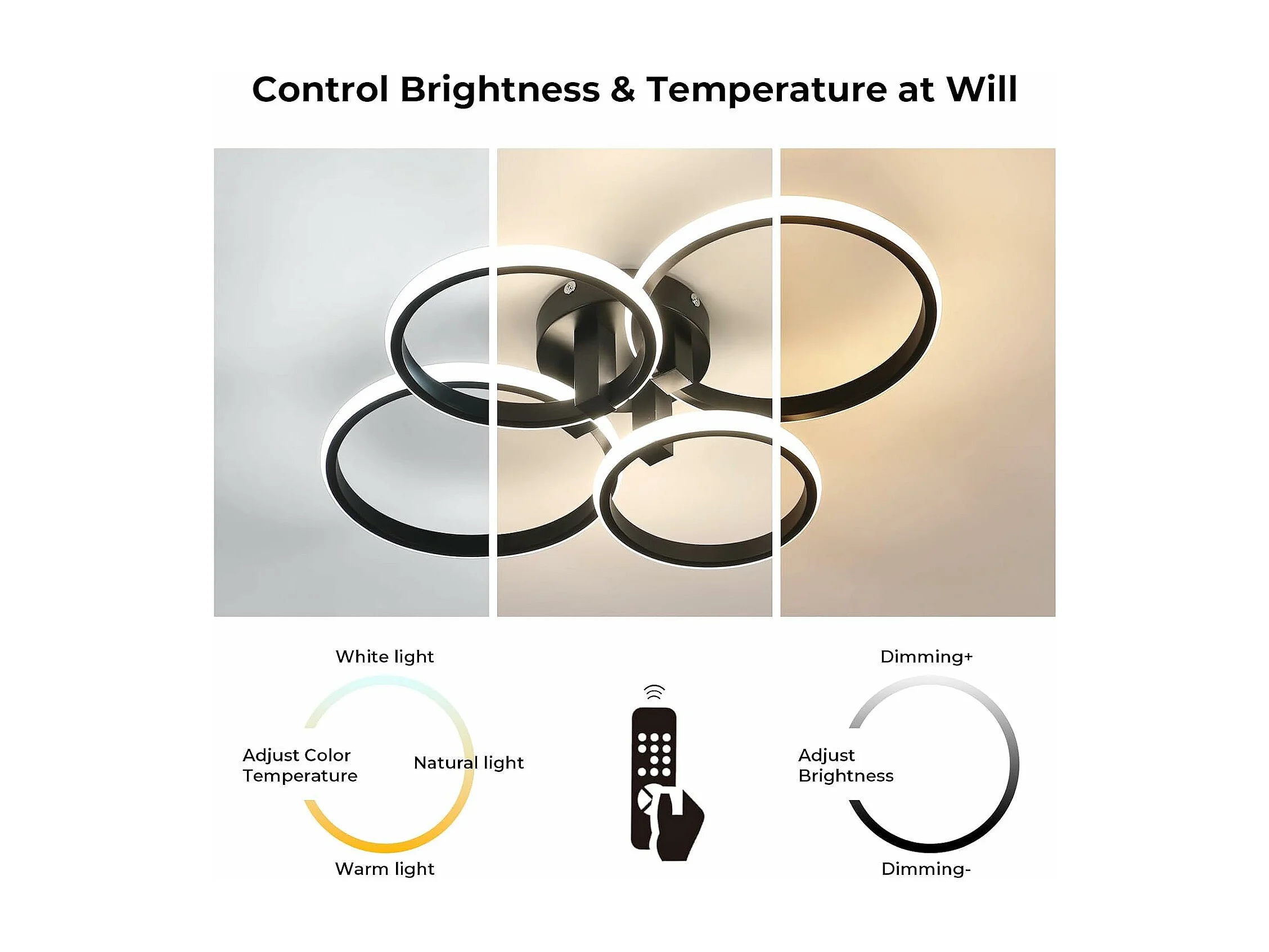Plafonnier LED Rond 4 Anneaux Dimmable Moderne - 76W avec Télécommande (3000K-6500K) Noir pour Chambre, Salon, Cuisine - Diamètre 58cm