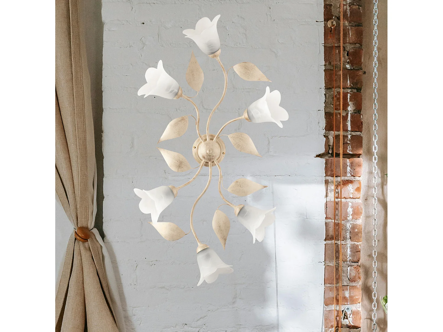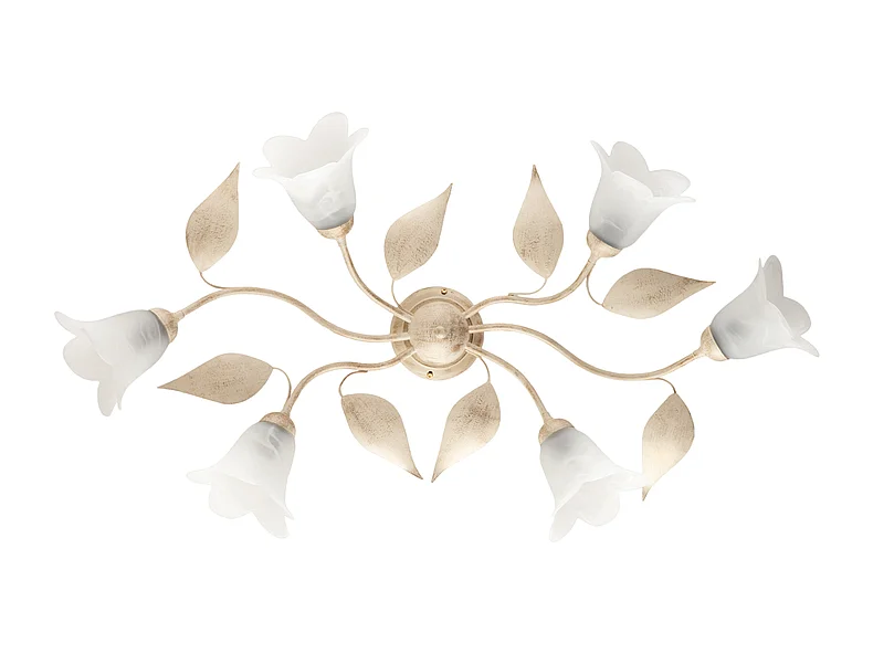 Plafonnier Olga fer ivoire, déco or antique, verre albâtre d.14, 6 lumières 70x52 cm design lumineux vintage