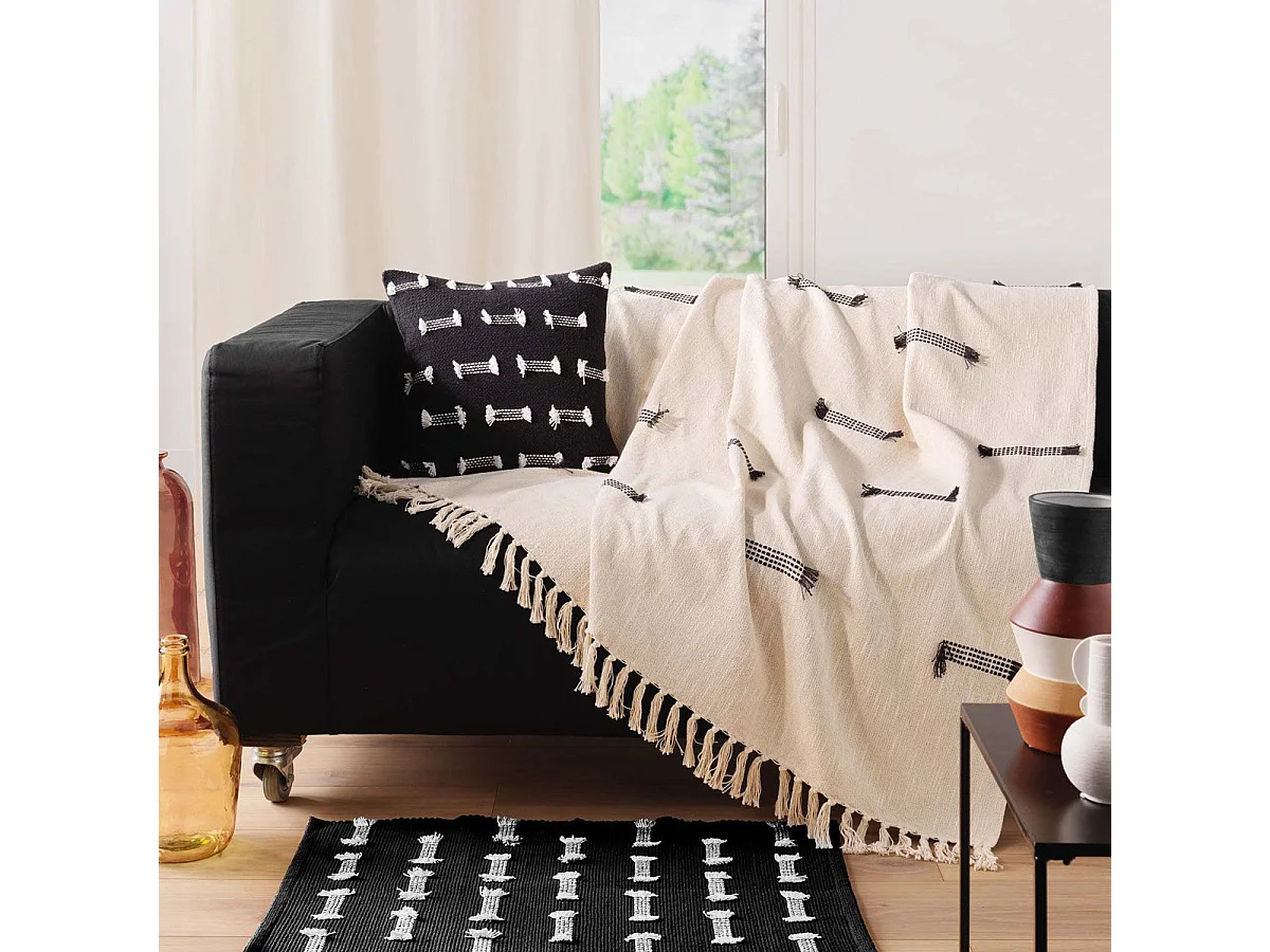 Plaid Jeté de Canapé 120x150cm Style Ethnique Noir et Blanc avec Franges - RAFY