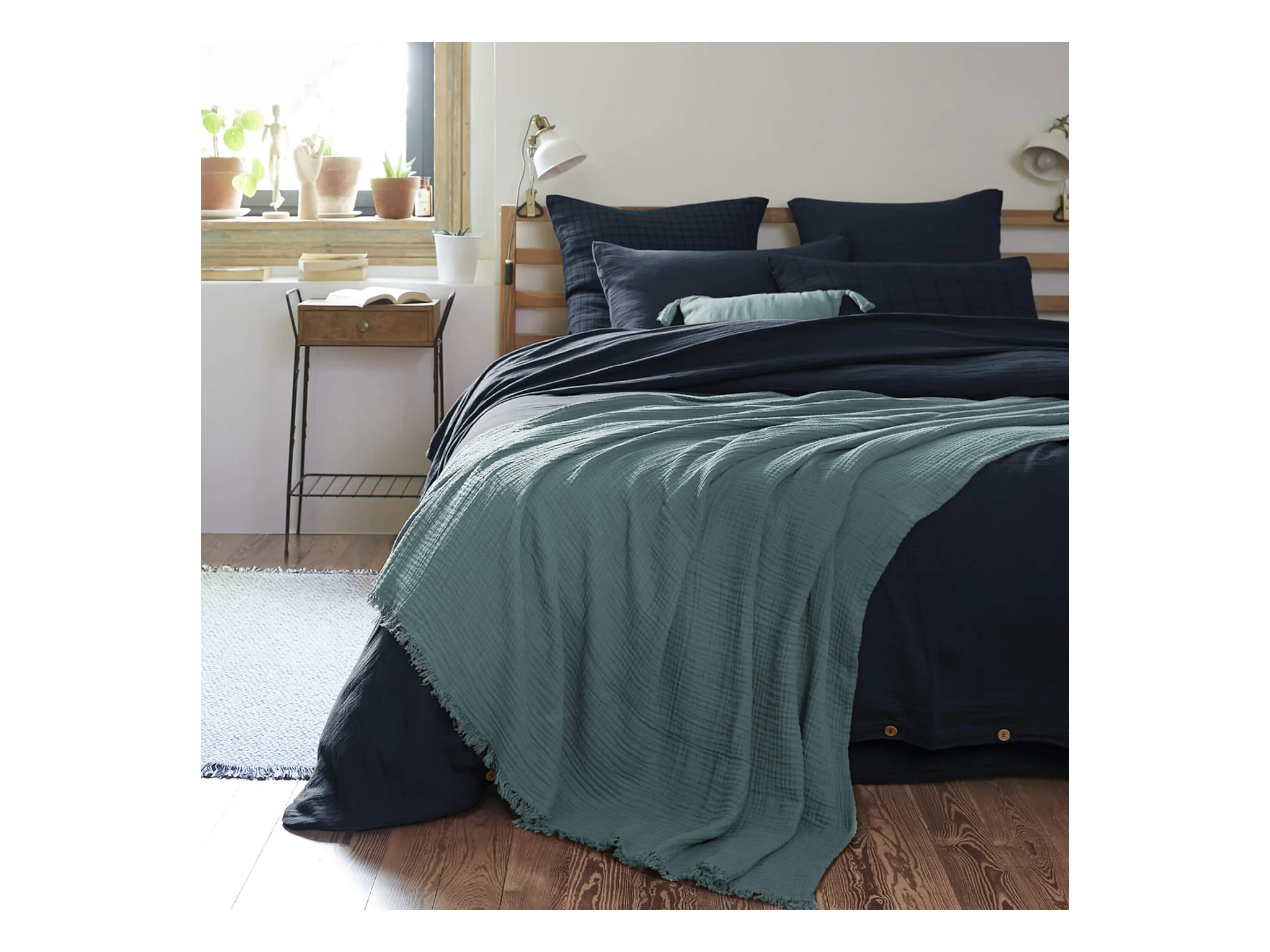Plaid gaze de coton à franges bleu canard 180x220 cm
