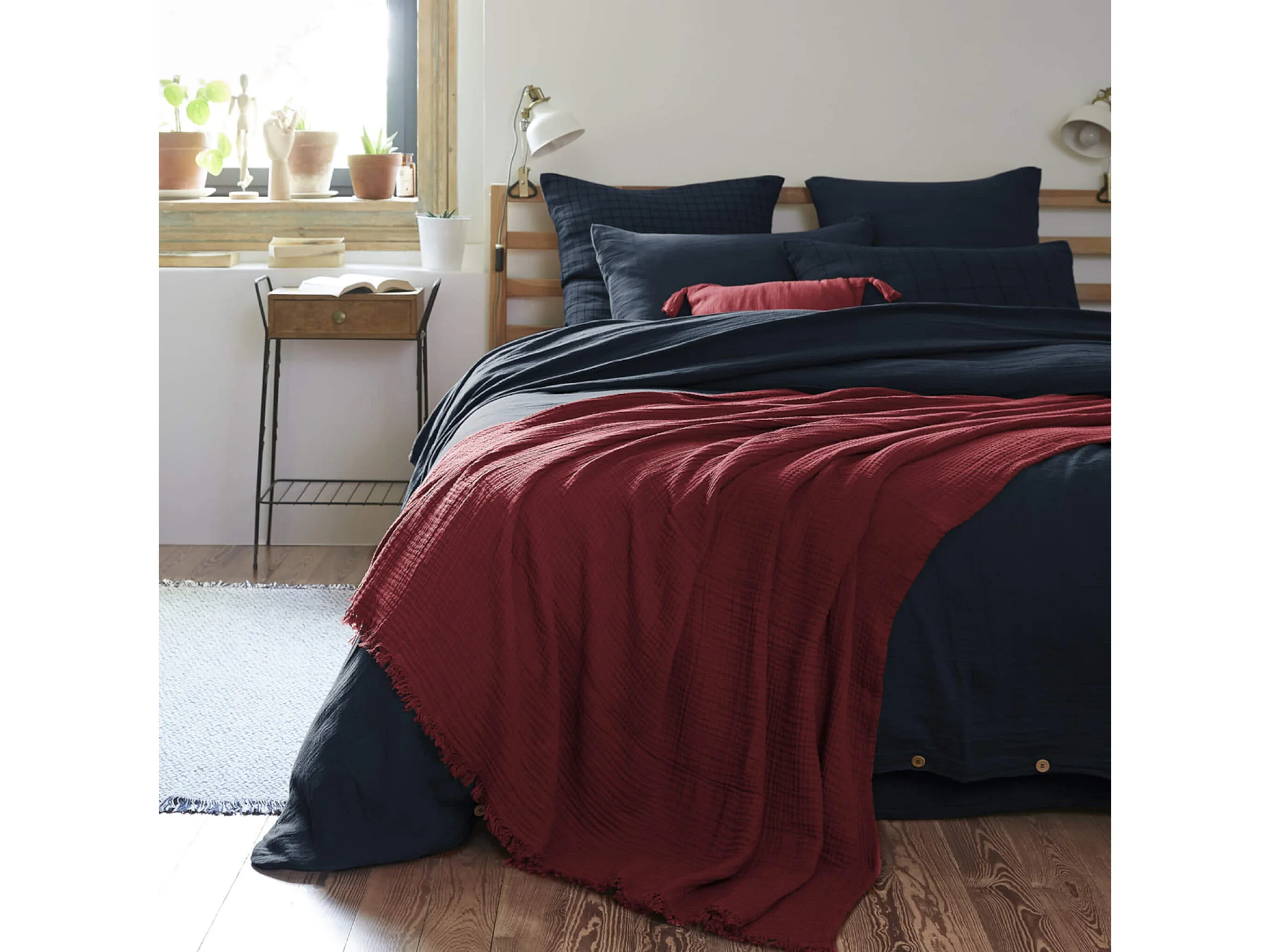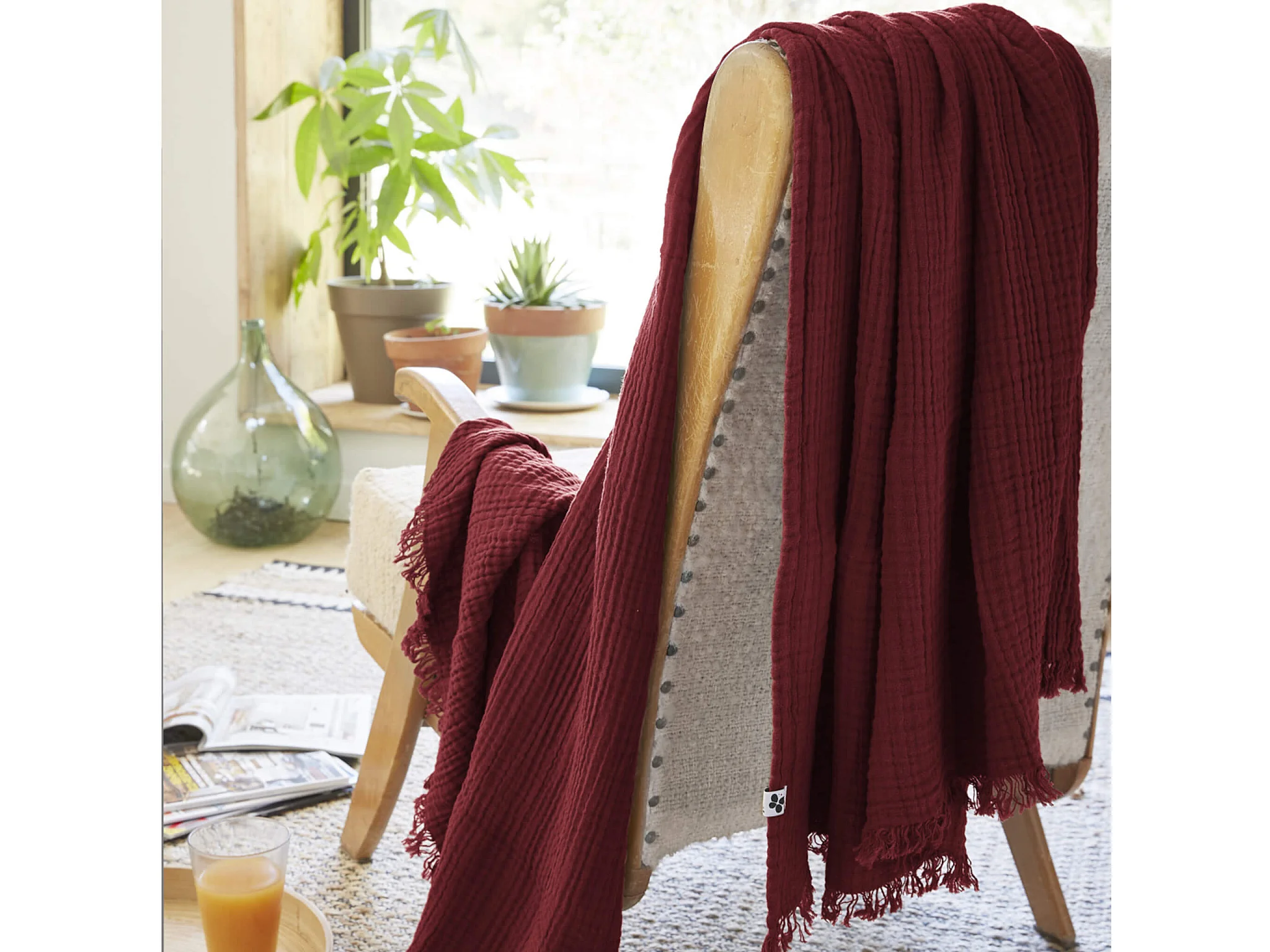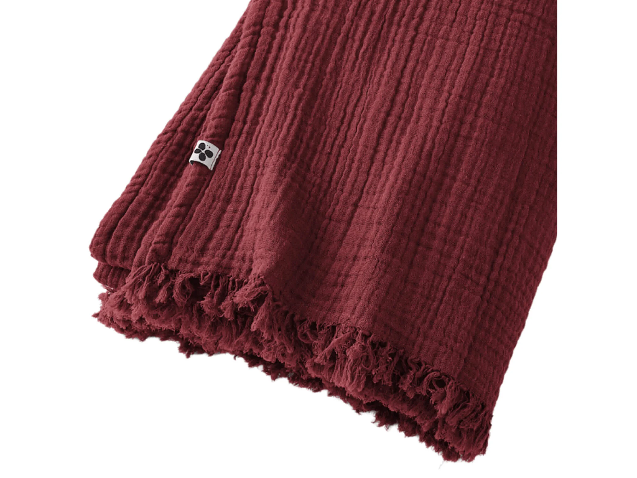 Plaid gaze de coton à franges bordeaux 180x220 cm
