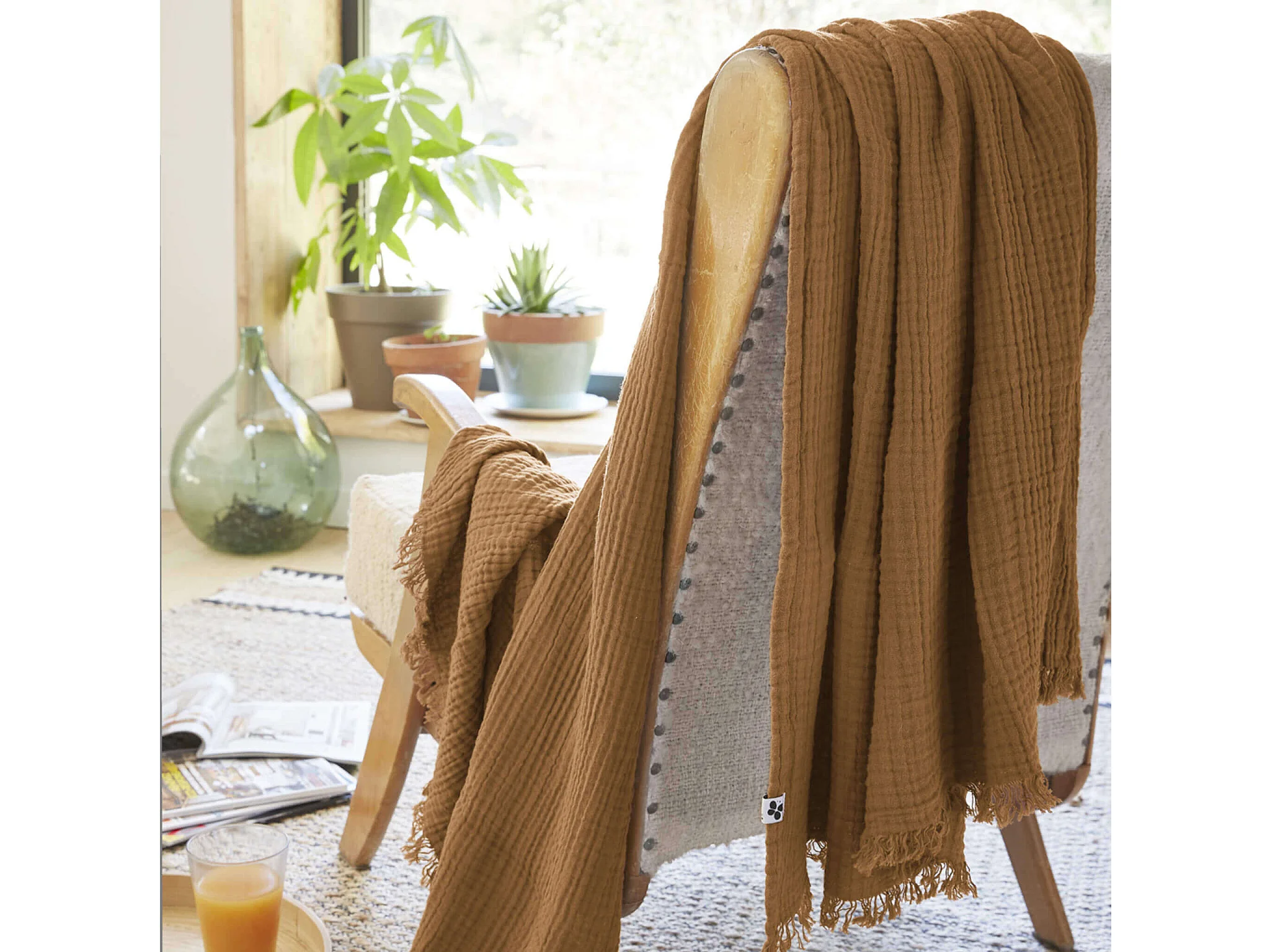 OUREA - Plaid à Franges 130x160cm 4 Epaisseurs Gaze de Coton Camel