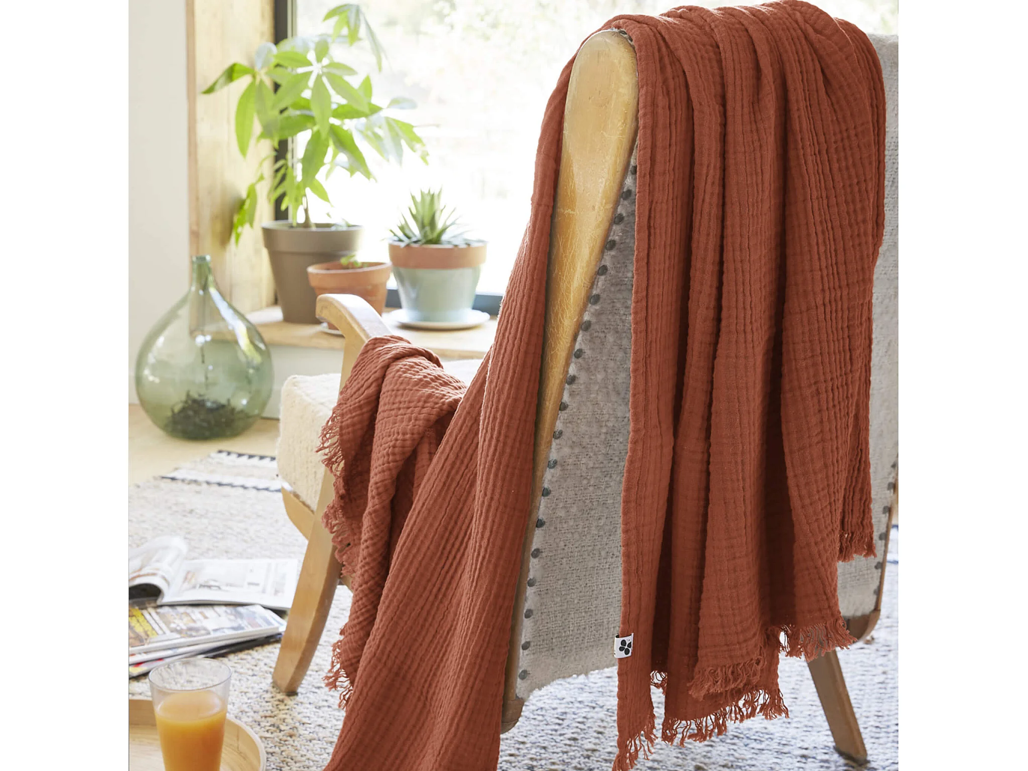 Plaid gaze de coton à franges orange terracotta 180x220 cm