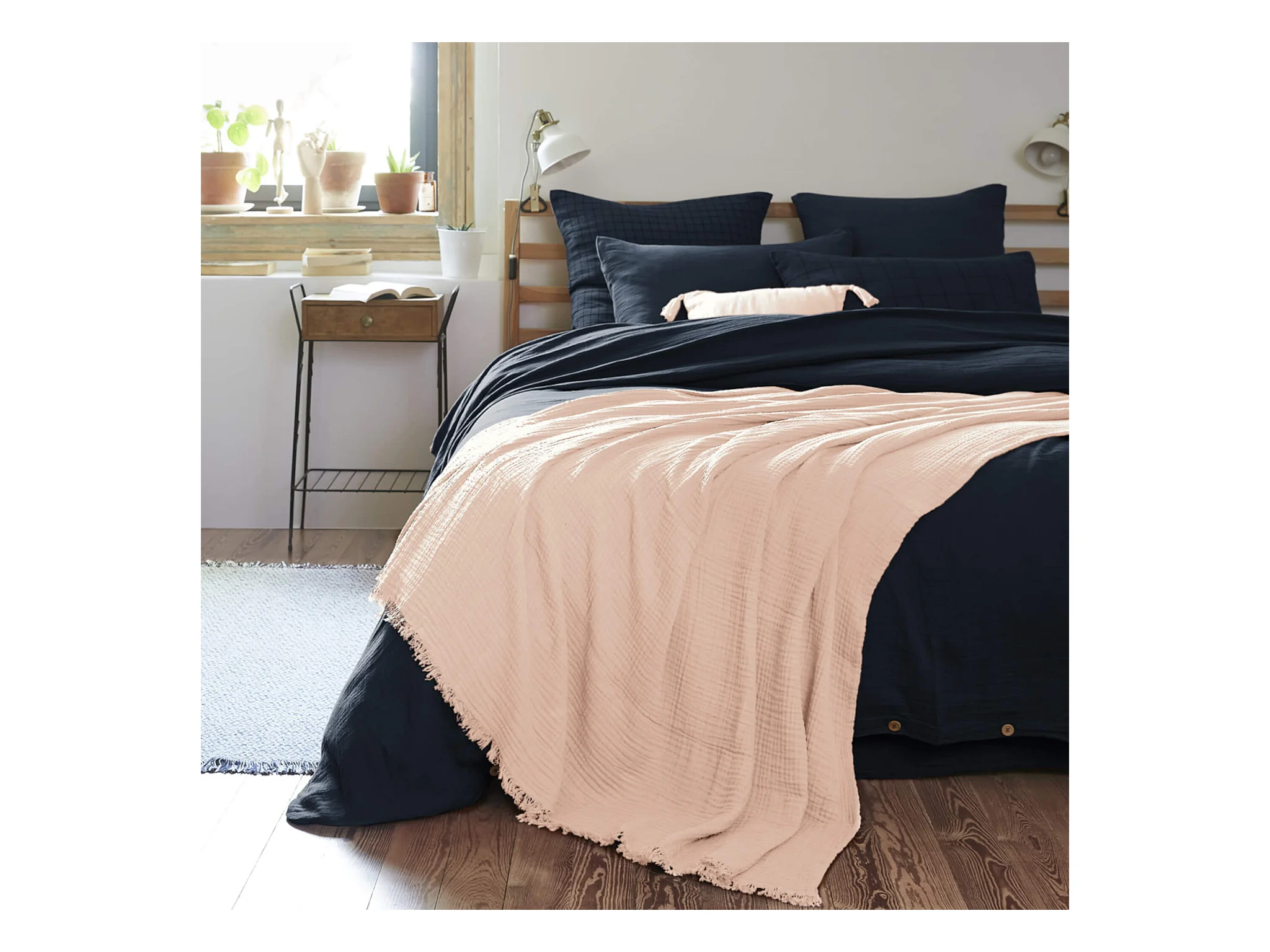 Plaid Uni en Coton "Lucile" 180x220cm Rose