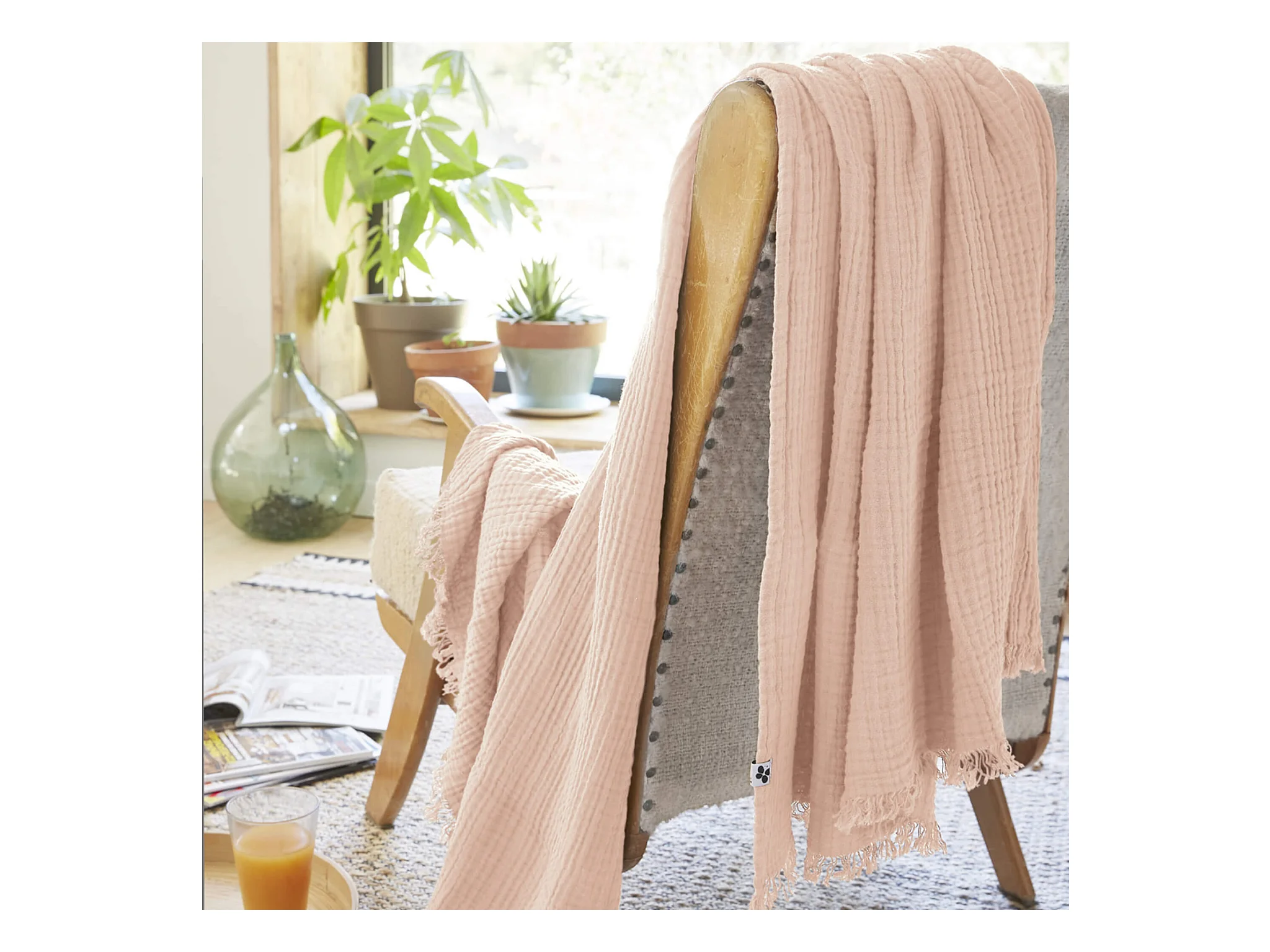 OUREA - Plaid à Franges 180x220cm 4 Epaisseurs Gaze de Coton Rose Pêche