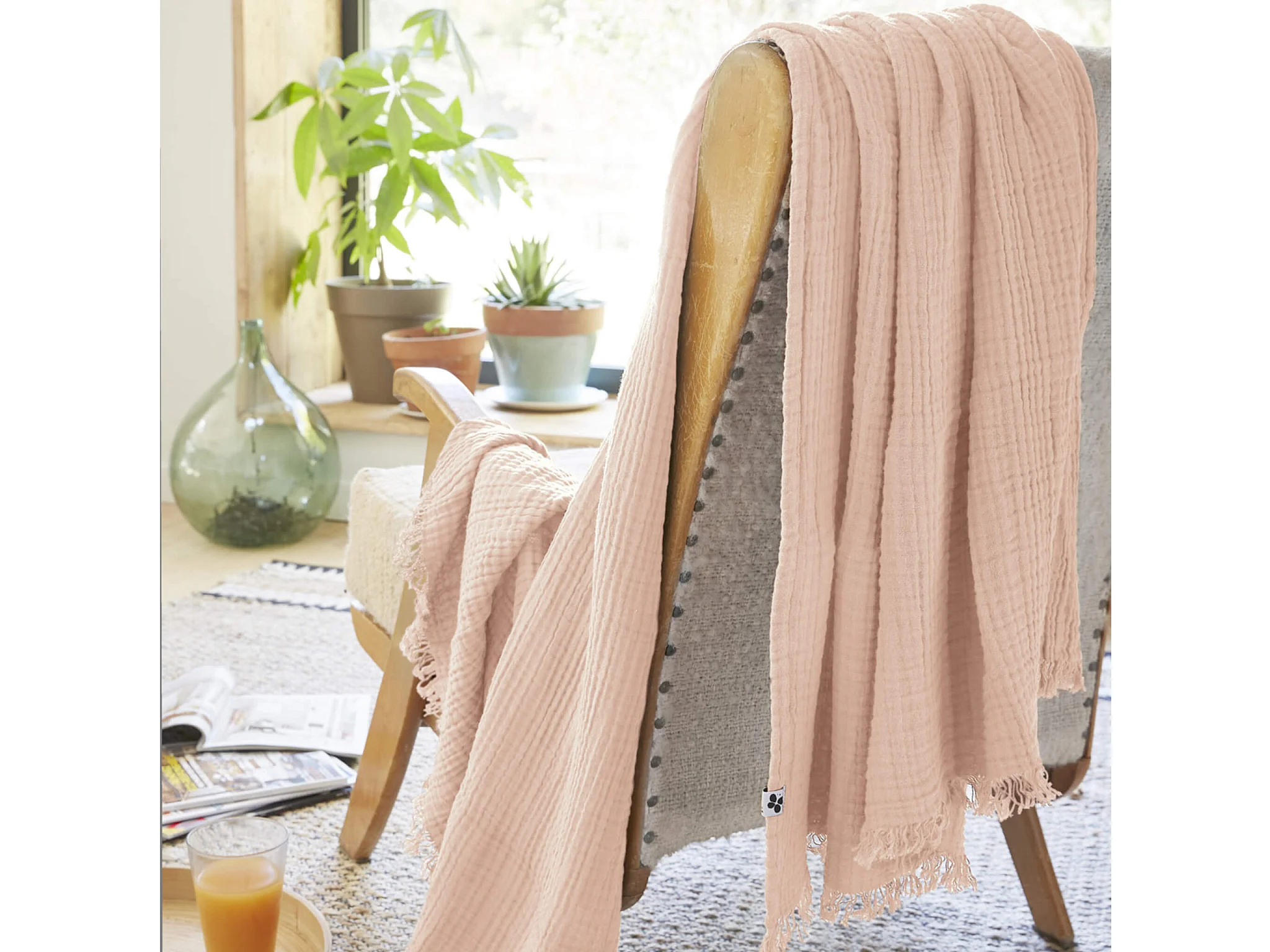 OUREA - Plaid à Franges 180x220cm 4 Epaisseurs Gaze de Coton Rose Pêche
