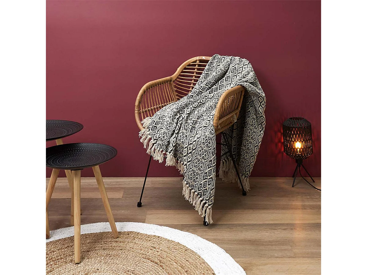 Plaid Jeté de Canapé 120x150cm Style Ethnique Noir et Blanc avec Franges - RAFY