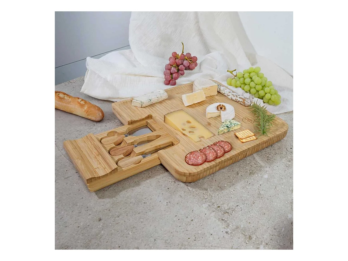 Planche apéro en bambou avec tiroir coulissant et couteaux à fromage inclus