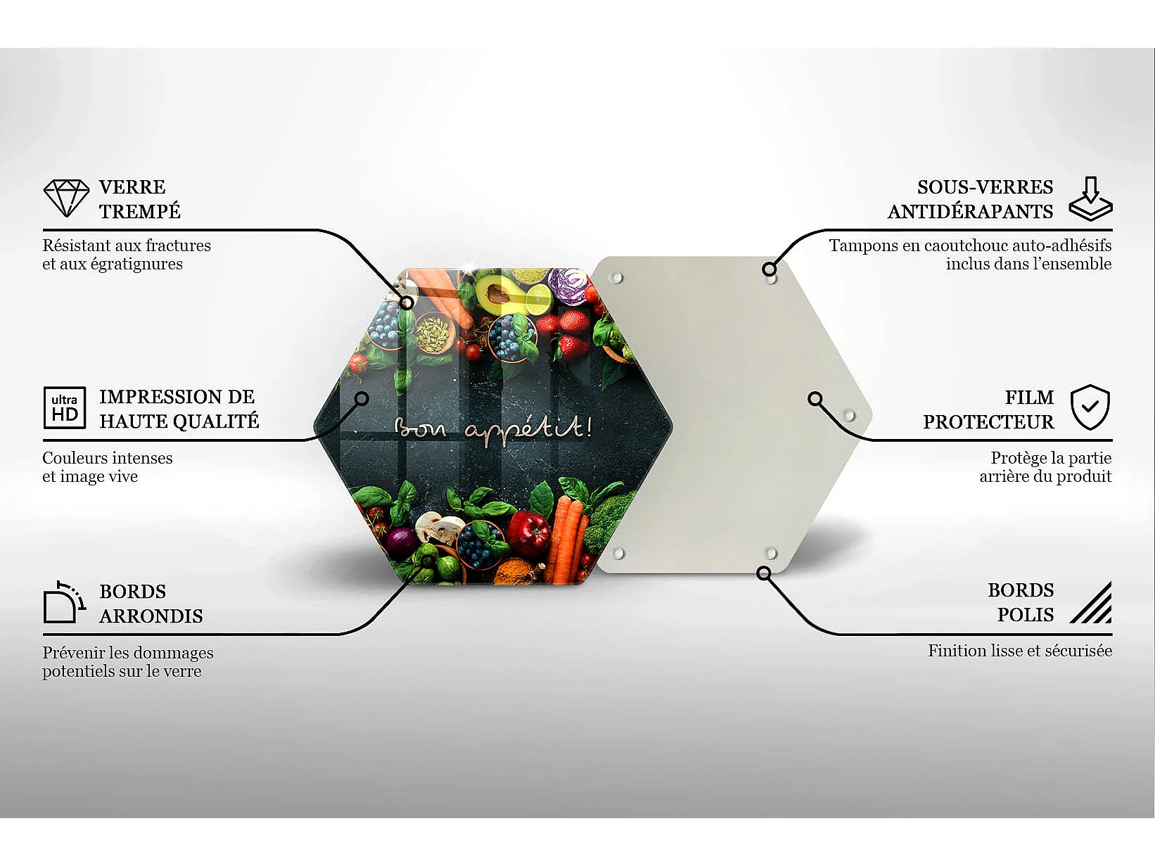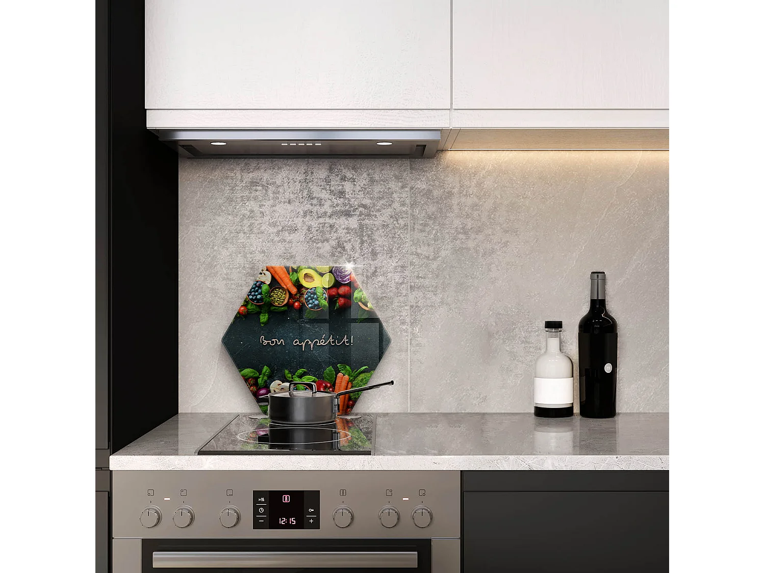 Planche de cuisine hexagonale en verre avec une phrase "Fruits et légumes, Bon appétit!" 40 cm