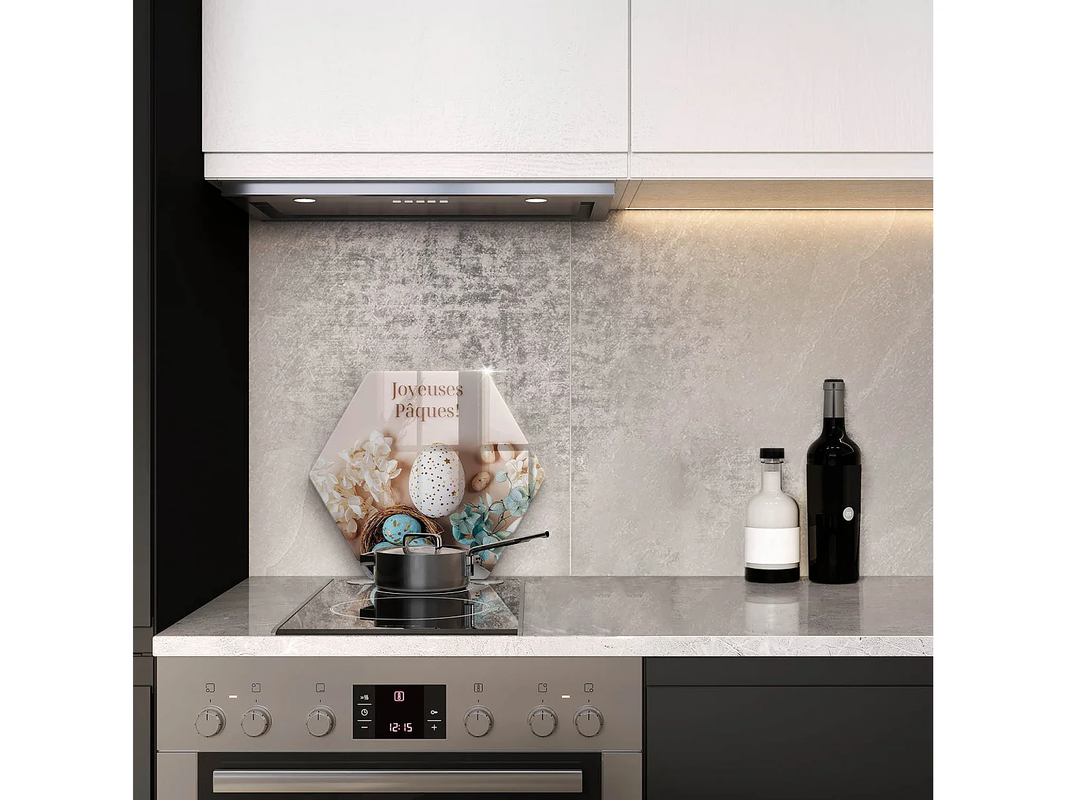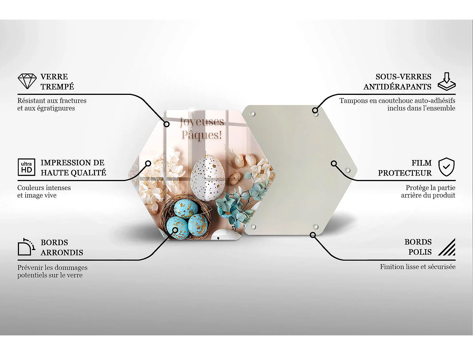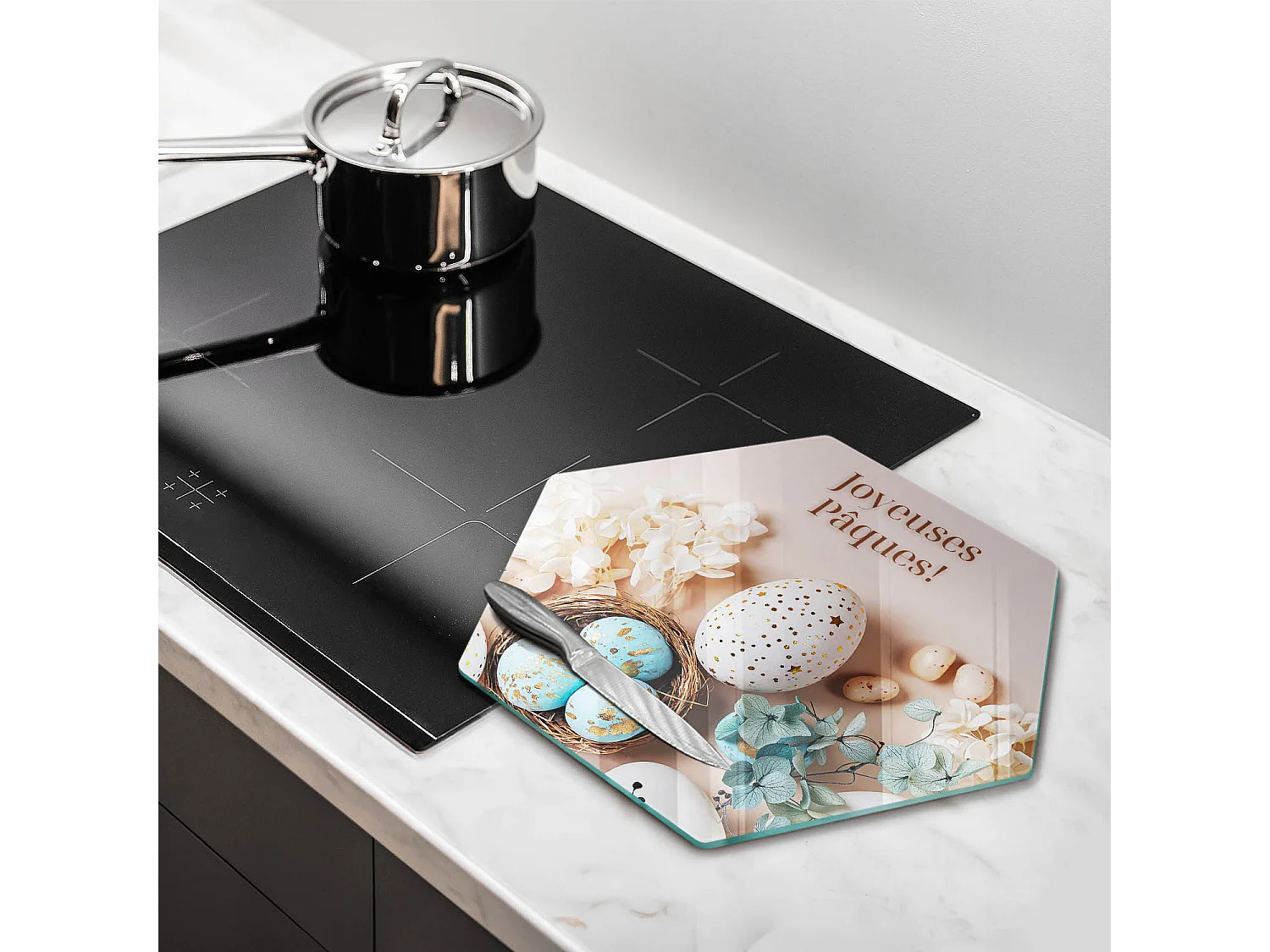 Planche de cuisine hexagonale en verre avec une phrase "Joyeuses Pâques!" 40 cm