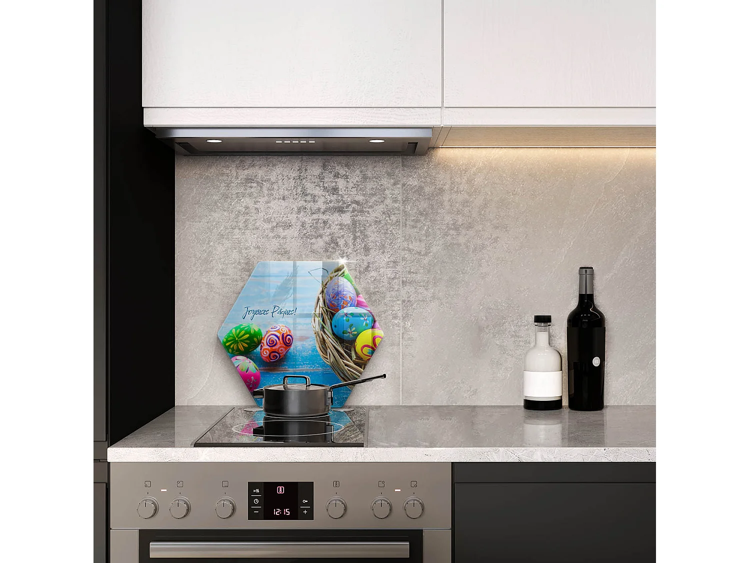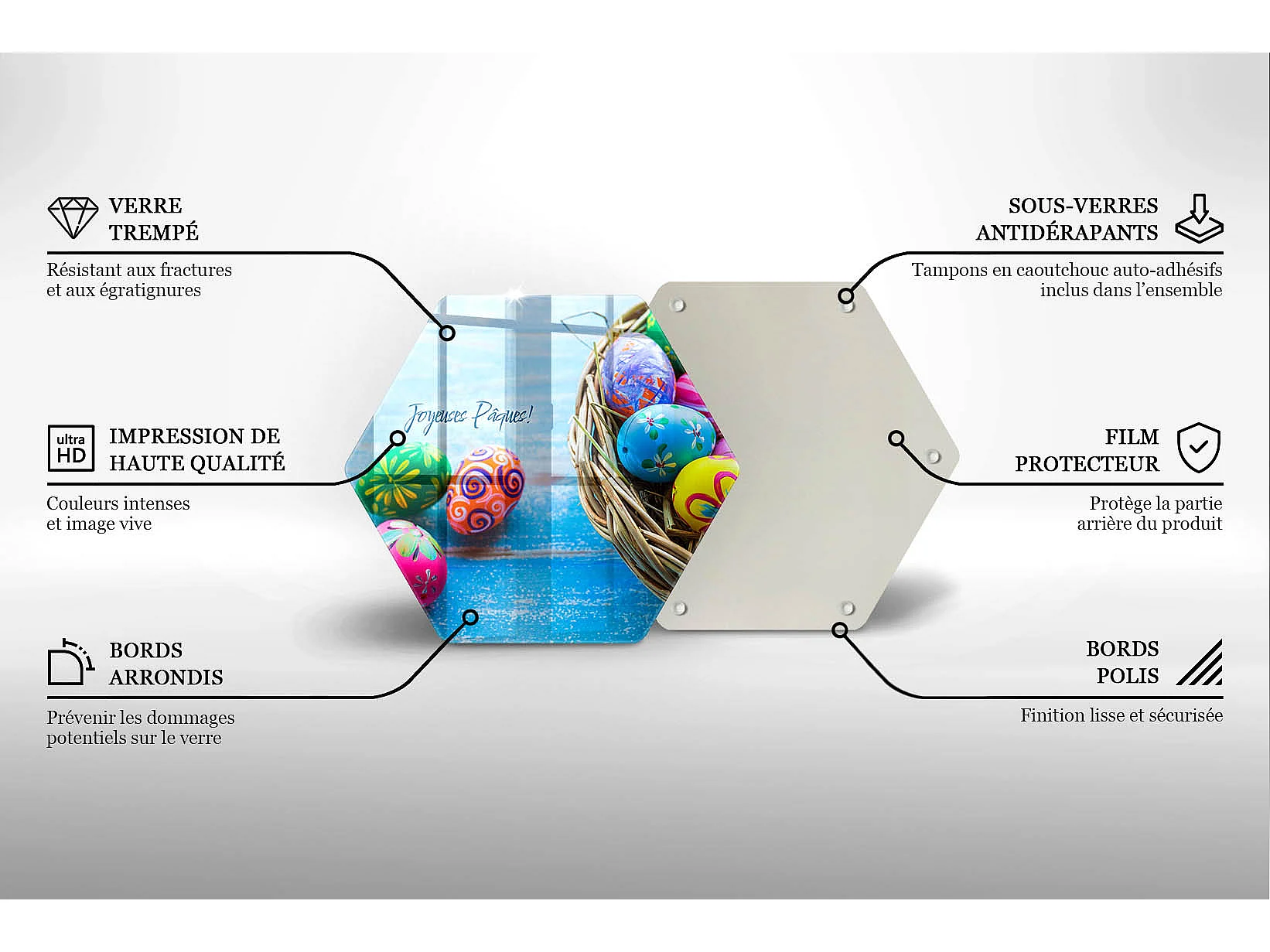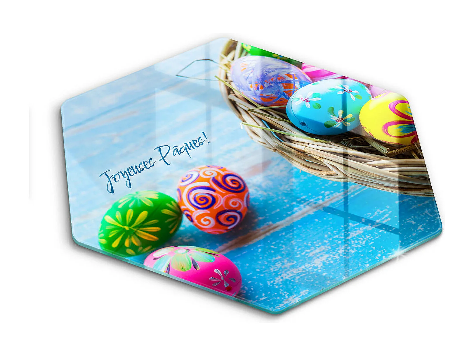 Planche de cuisine hexagonale en verre avec une phrase "Joyeuses Pâques!" 40 cm