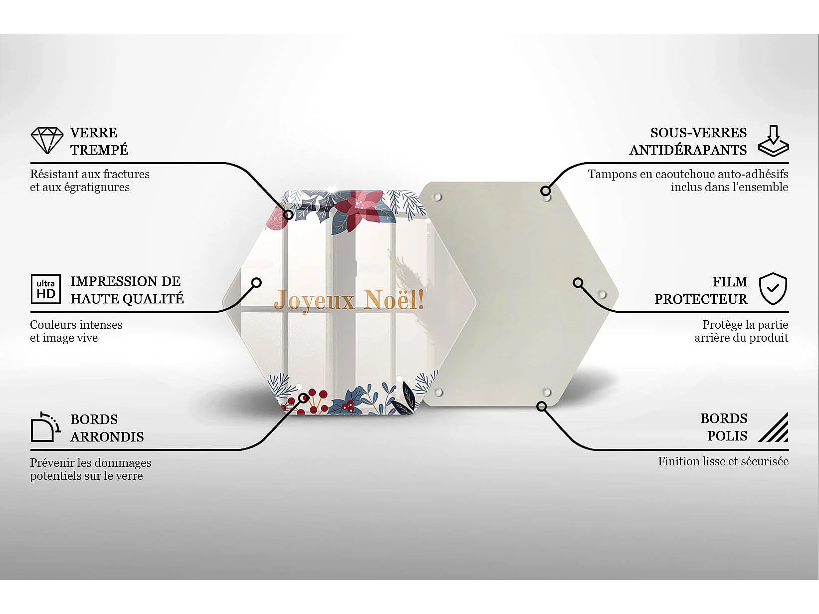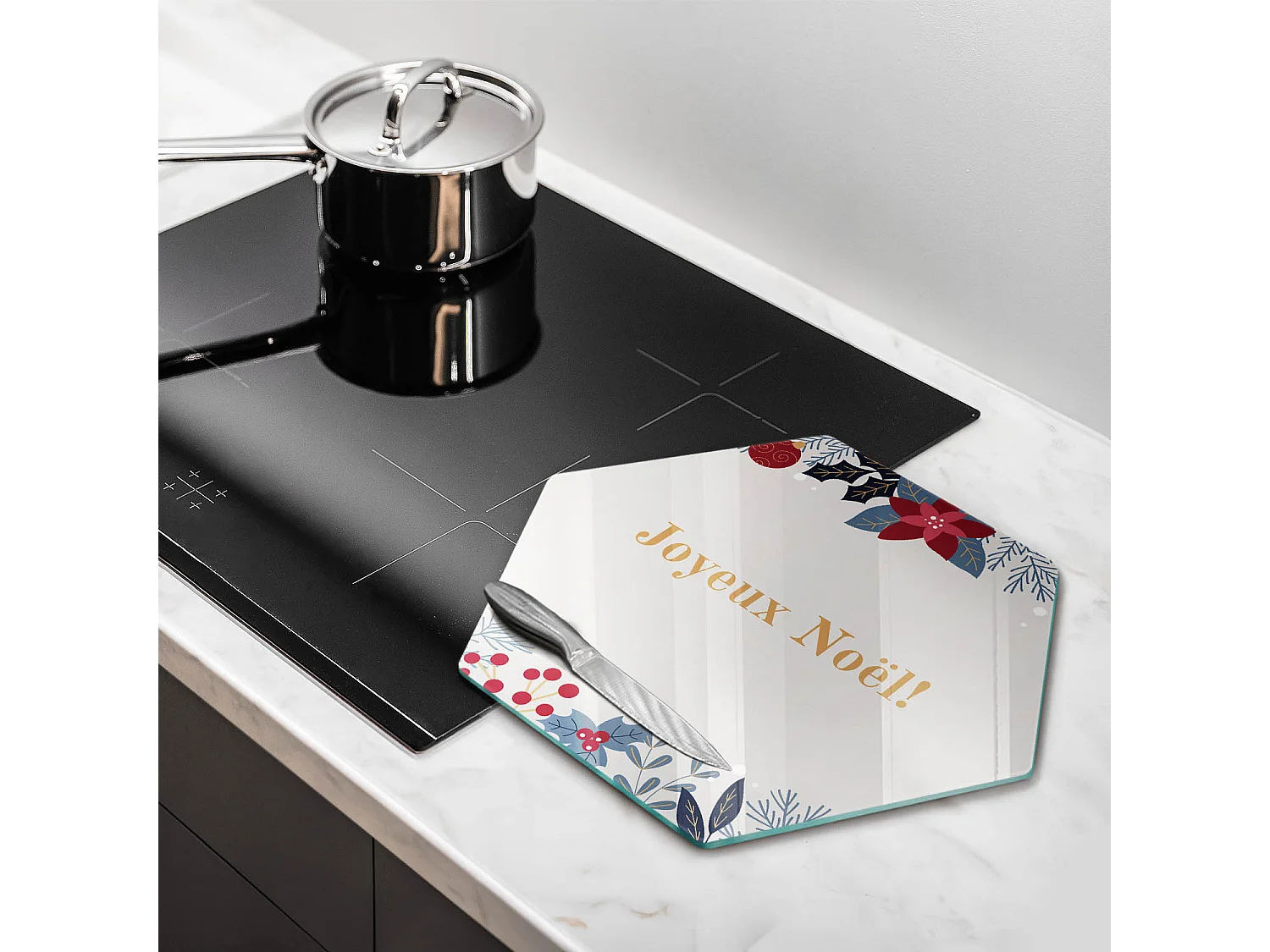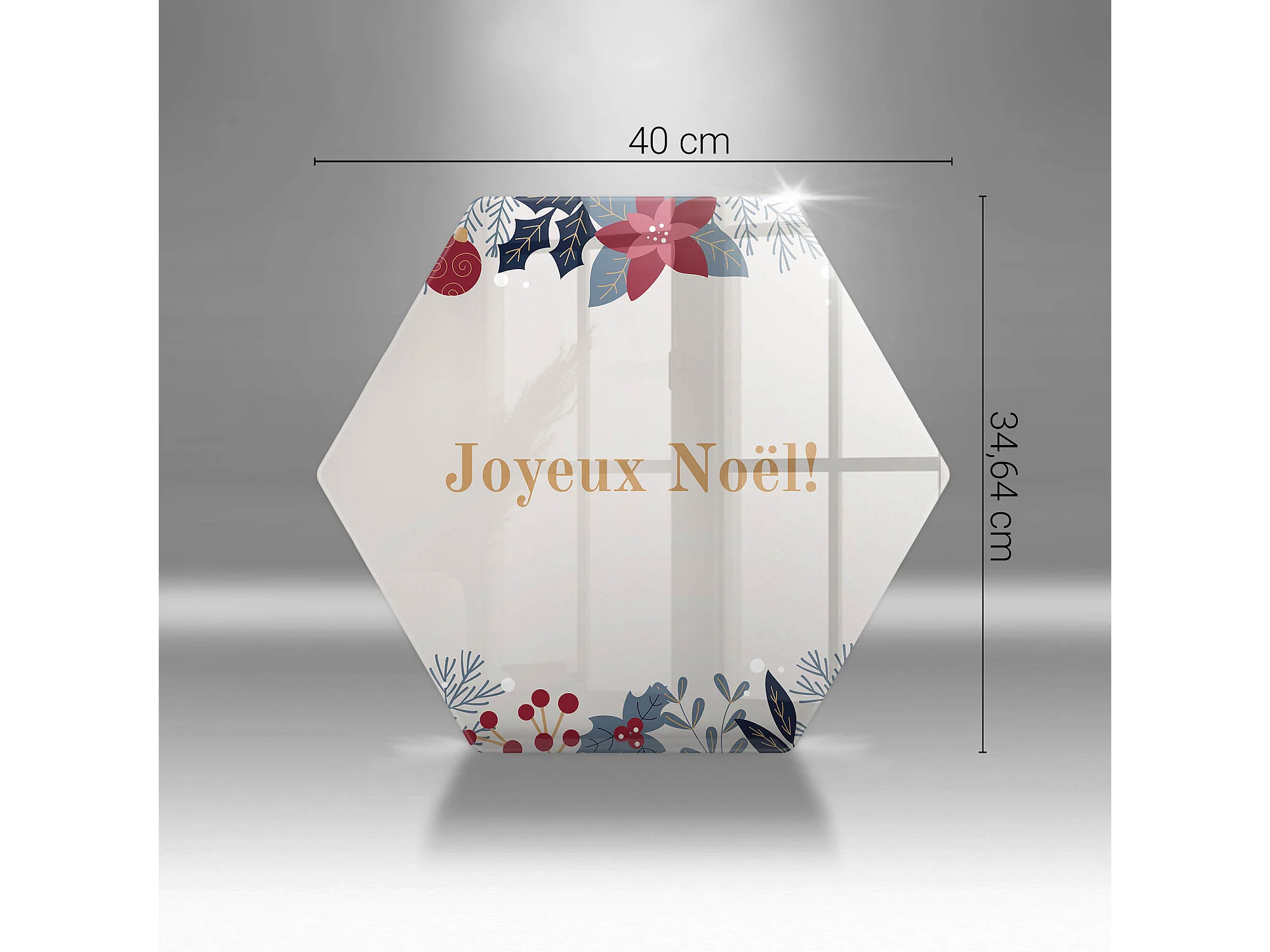 Planche de cuisine hexagonale en verre avec une phrase "Noël: Joyeux Noël!" 40 cm