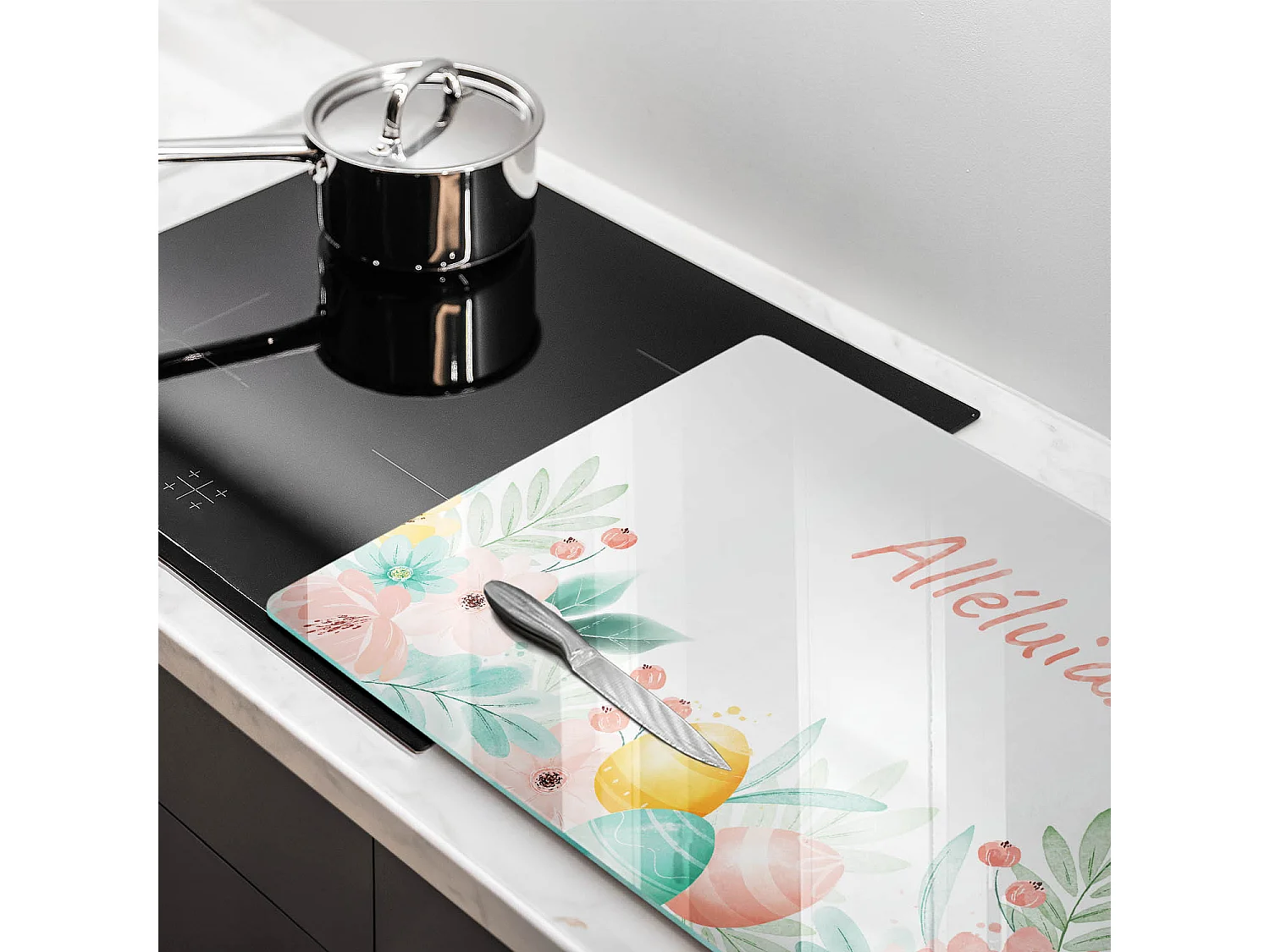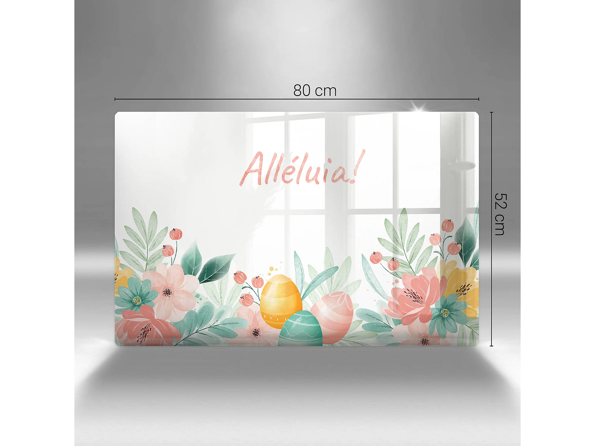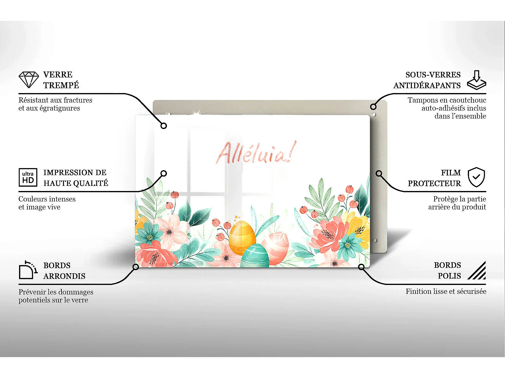 Planche de cuisine rectangulaire en verre avec une phrase "Motif: Alléluia festif!" 80x52 cm