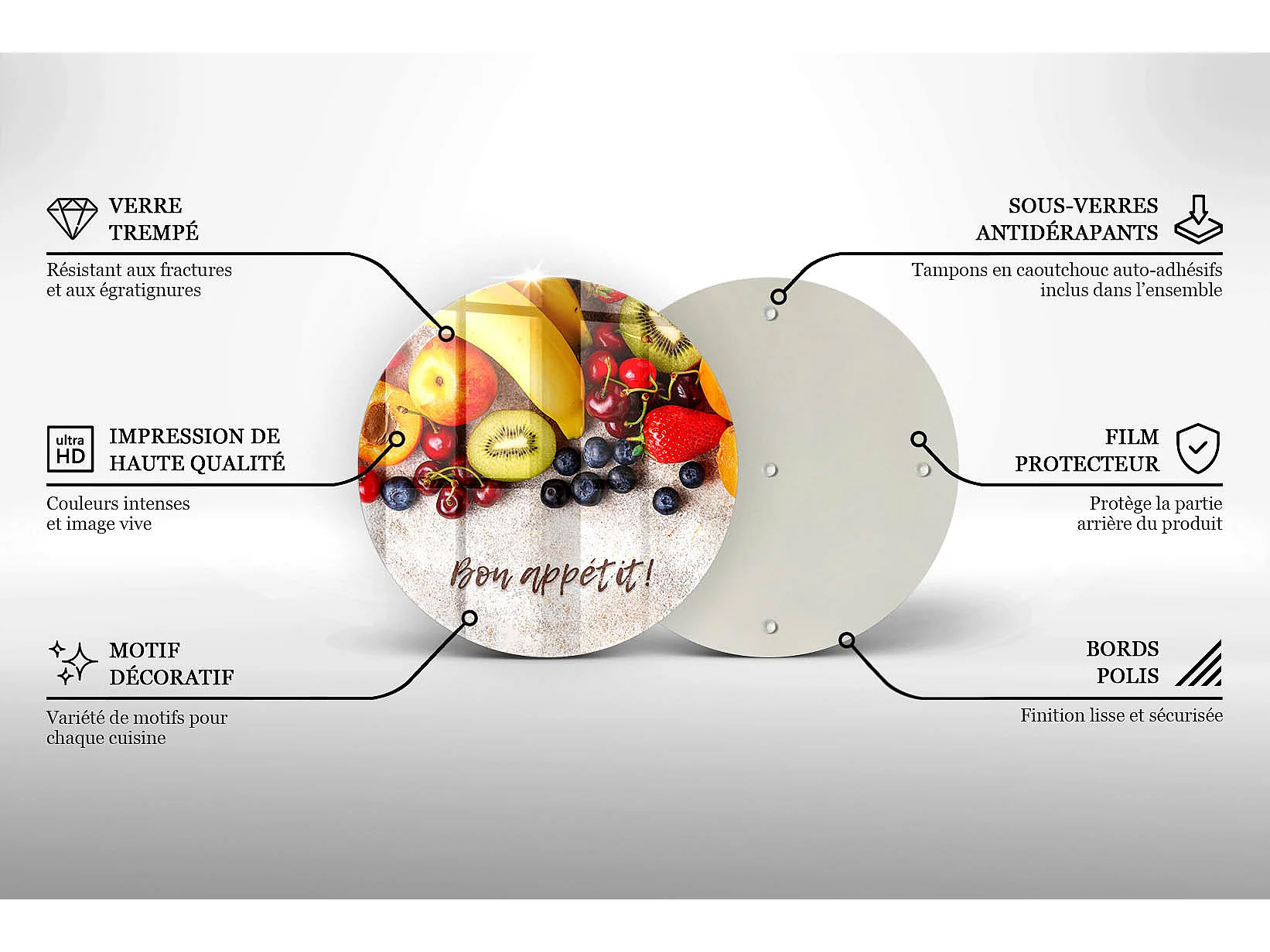 Planche de cuisine ronde en verre avec une phrase "Fruits, Bon appétit!" 30 cm