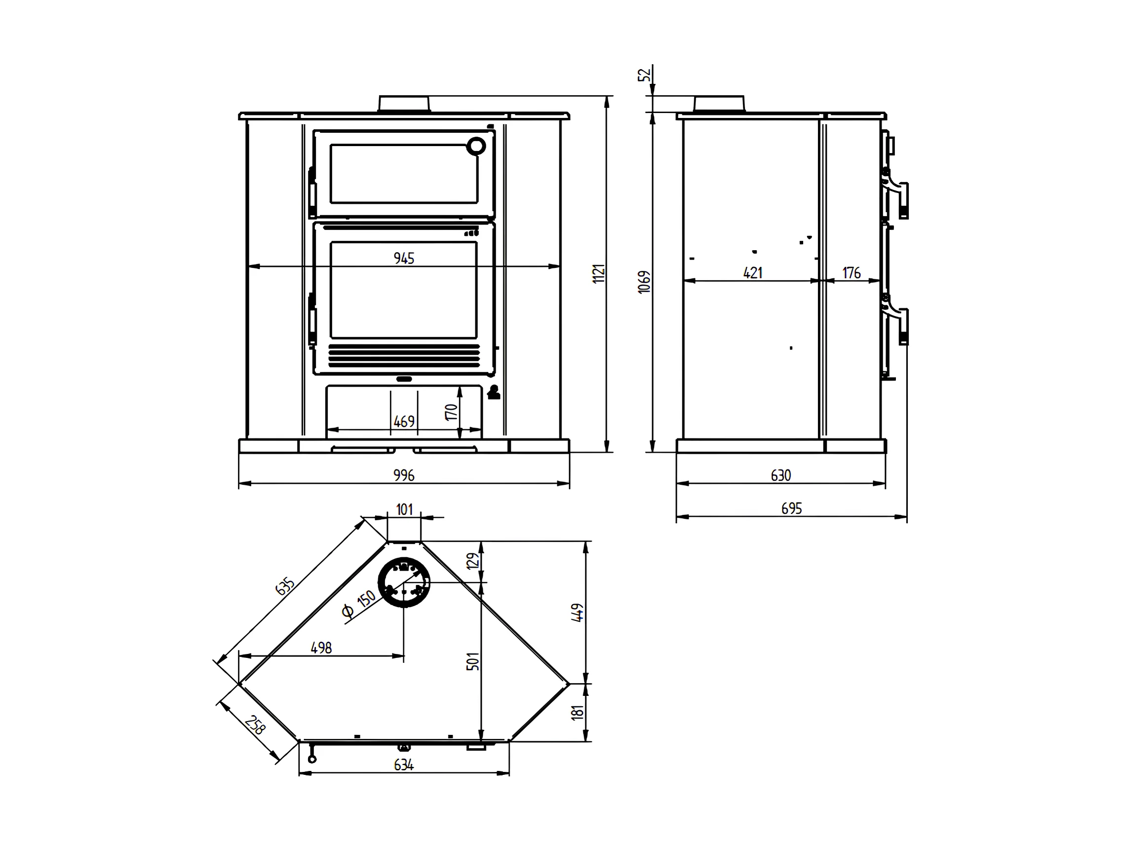 Poêle à bois de coin en acier, four de face, bûcher inférieur - GreenFlamme