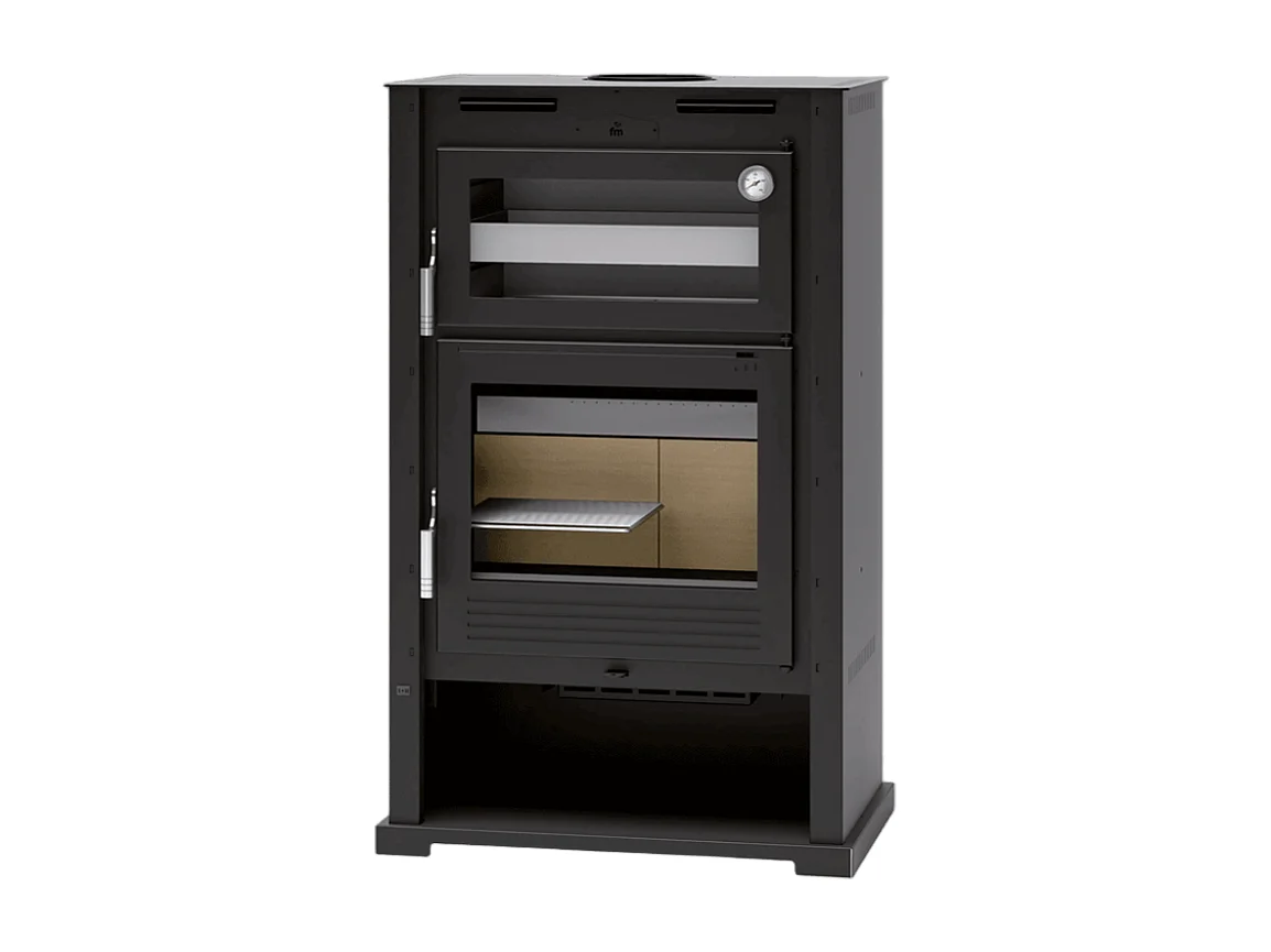 Poêle à bois en acier, double combustion, Four supérieur de face en inox, bûcher inférieur - Warmilo - avec turbine