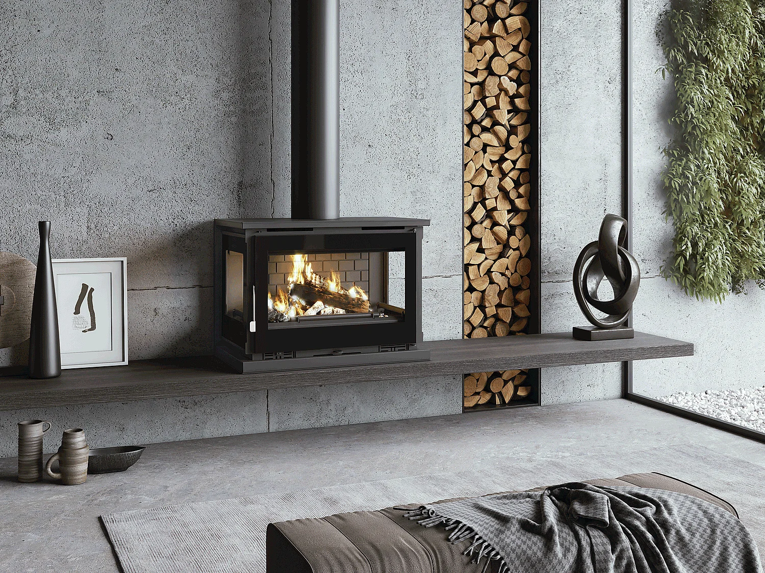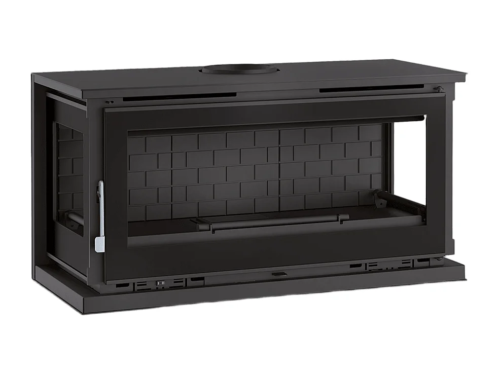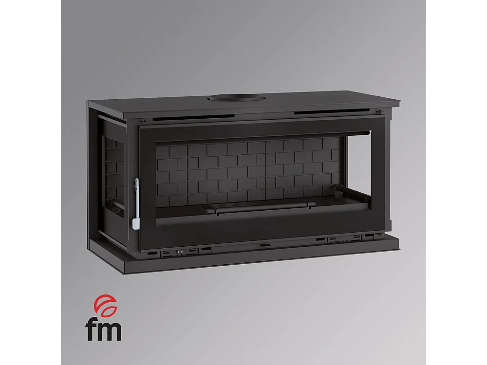 Poêle-cheminée à suspendre, 3 cotés vitrés, avec turbines, verre serigraphié - Cosynéo - Intérieur en fonte