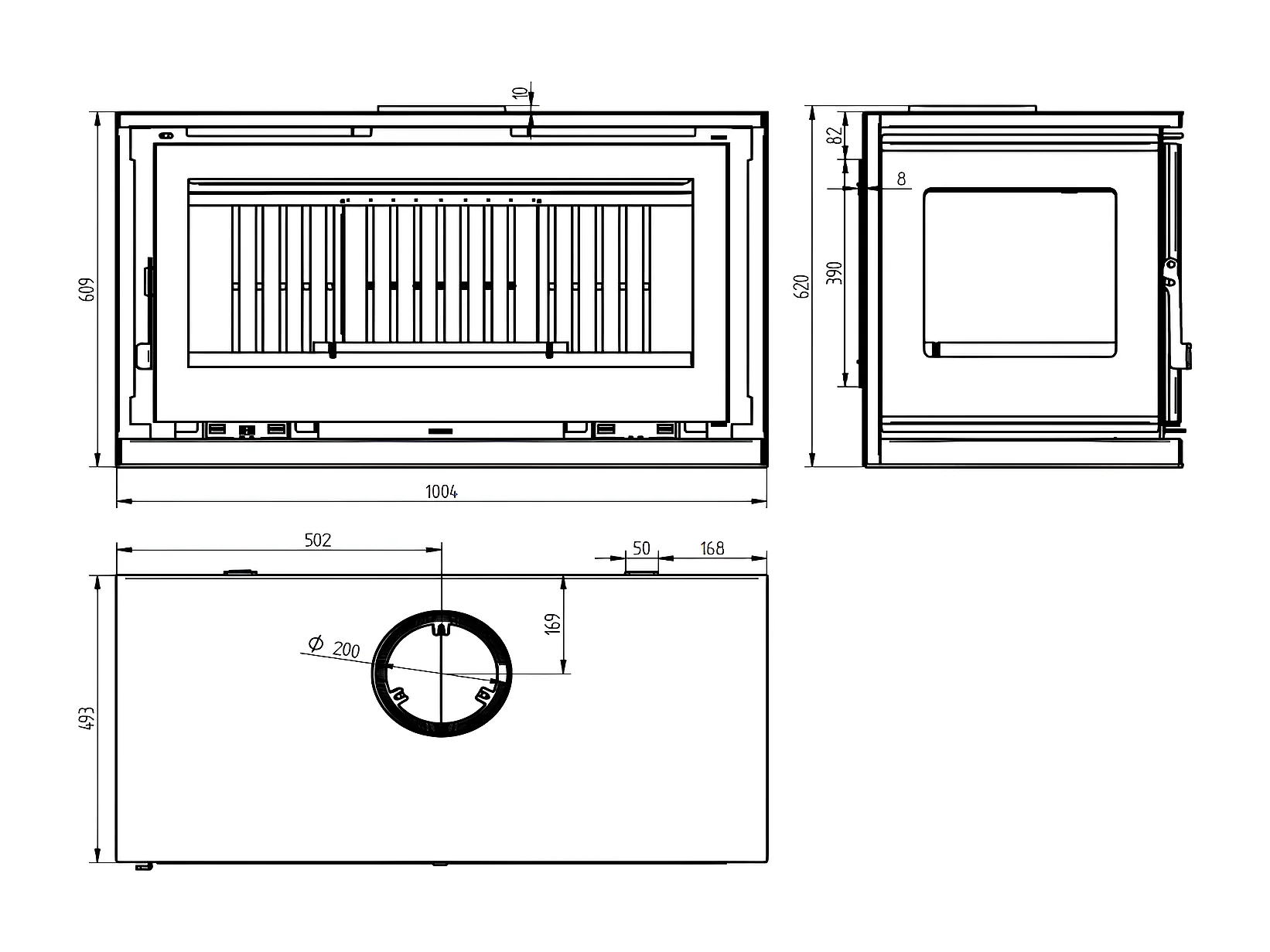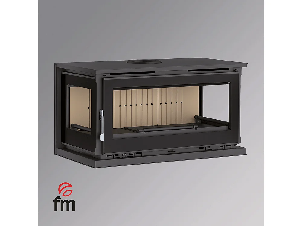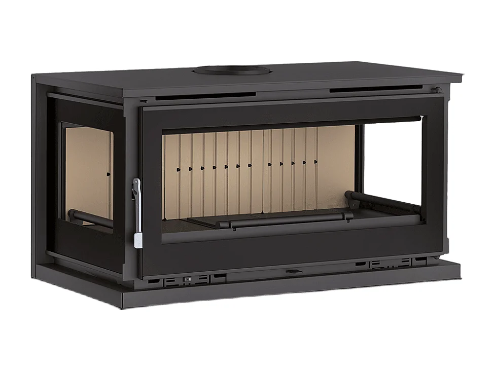 Poêle-cheminée à suspendre, 3 cotés vitrés, avec turbines, verre serigraphié - Onirique - Intérieur en vermiculite