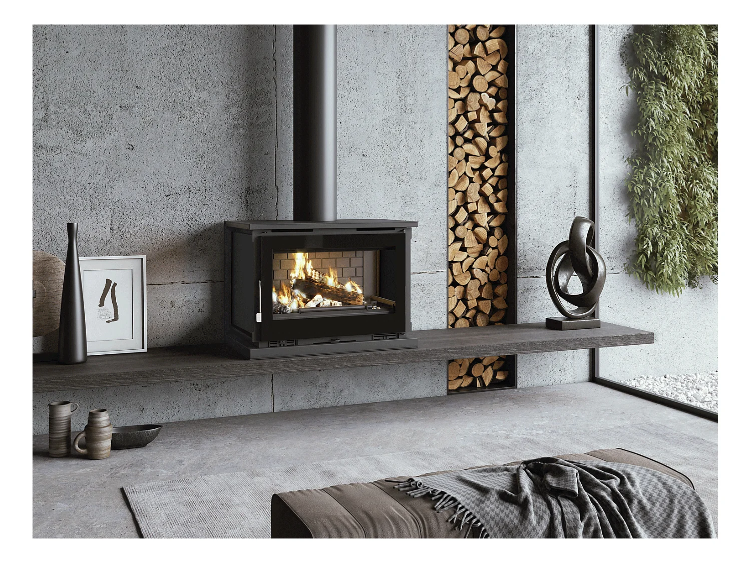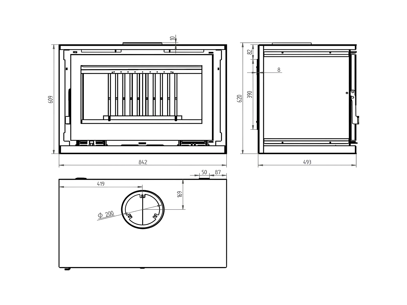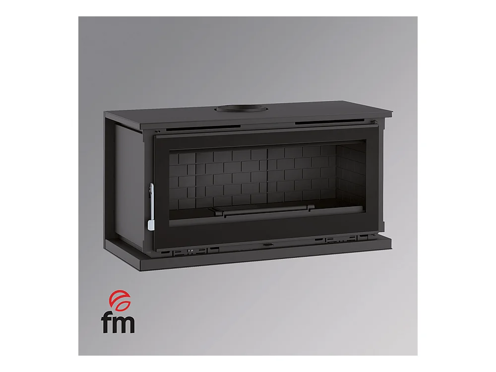 Poêle-cheminée à suspendre, avec turbines, verre serigraphié - BioBraze - Intérieur en fonte