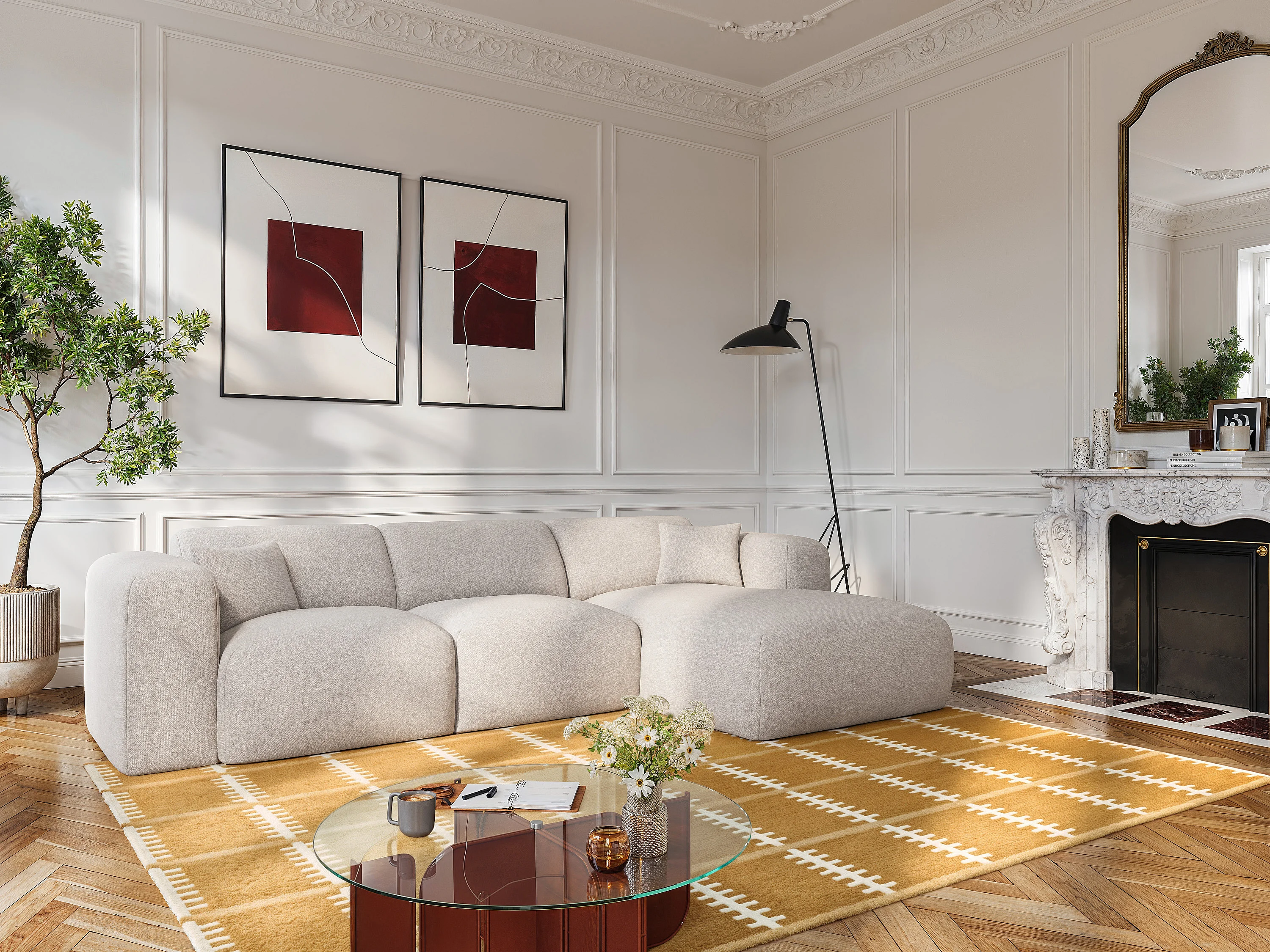 Grand canapé d'angle droit convertible express en tissu chiné beige - Matelas 16 cm mémoire de forme POGNI