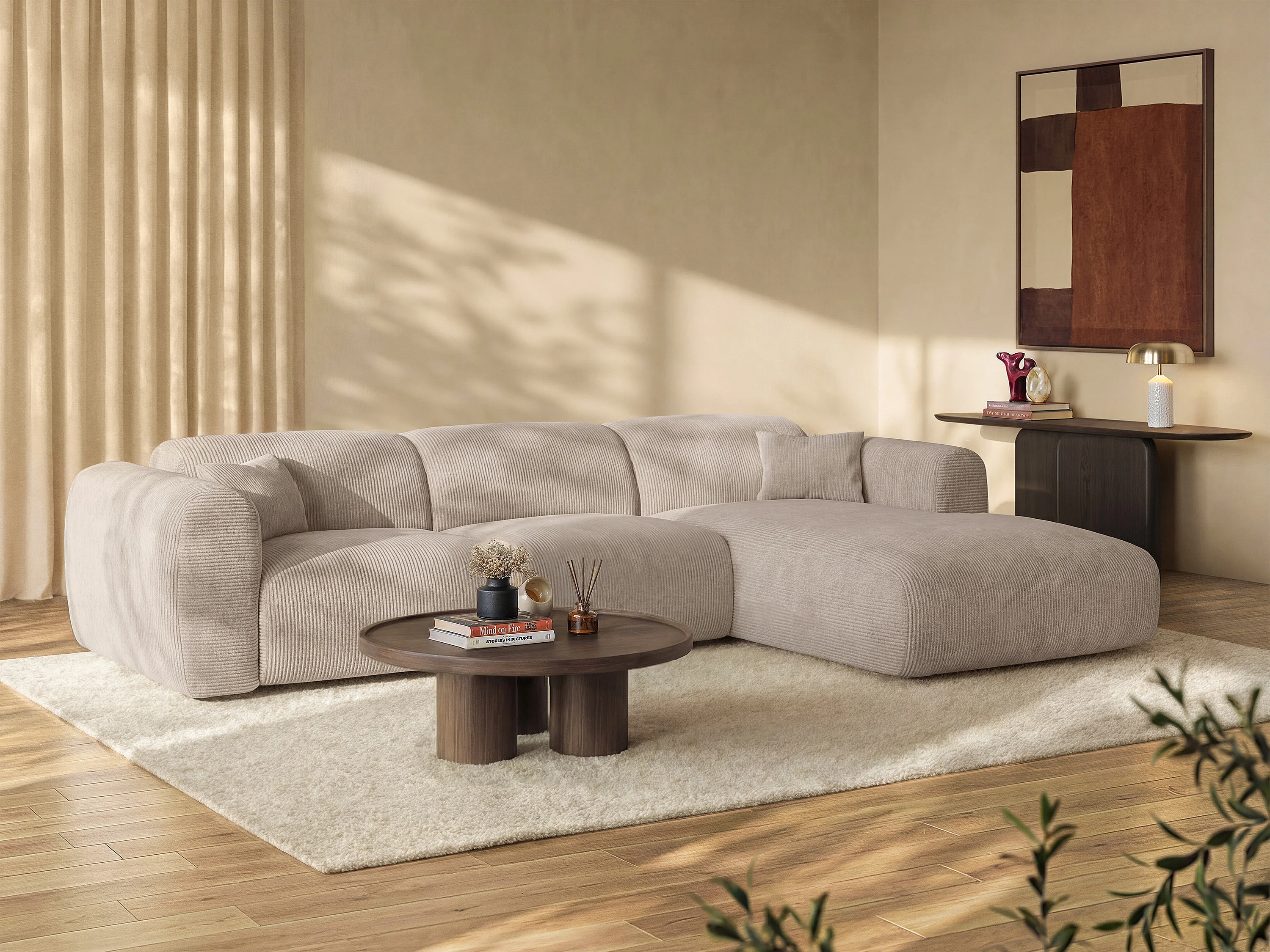 Grand canapé d'angle droit convertible express en velours côtelé fines côtes beige - Matelas 13 cm mémoire de forme POGNI