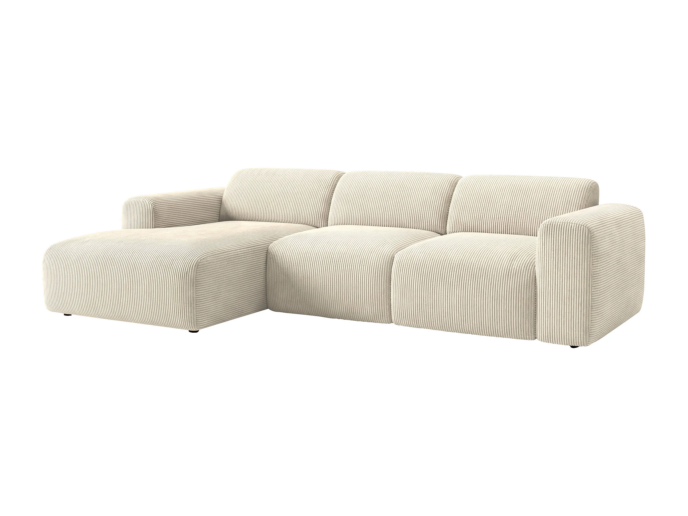 Grand canapé d'angle gauche avec assise coulissante électrique en velours côtelé fines côtes beige POGNI de Maison Céphy