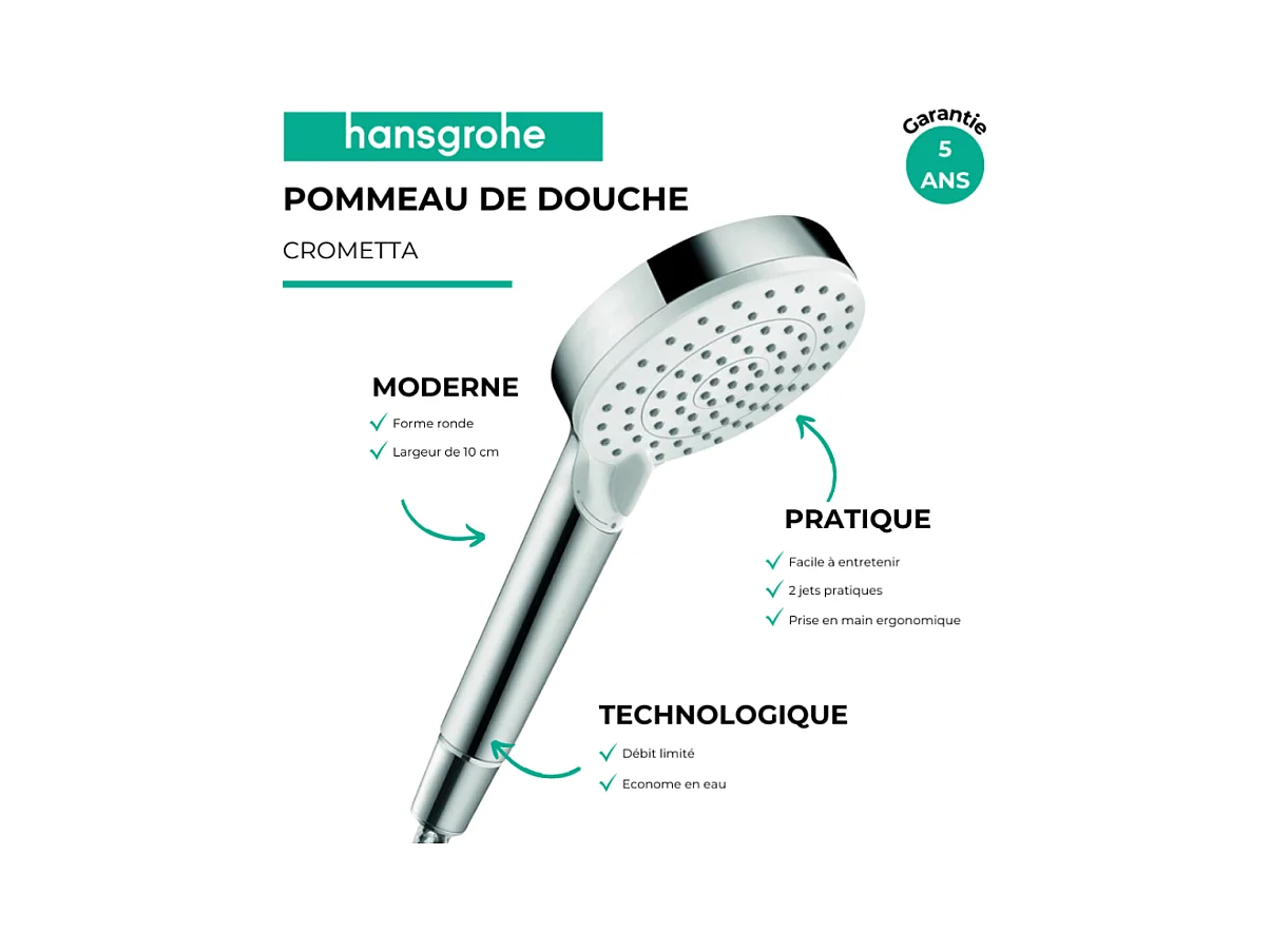 Pommeau de douche HANSGROHE Crometta EcoSmart 2 jets blanc/chromé + flexible de douche 2 m HANSGROHE Metaflex chromé