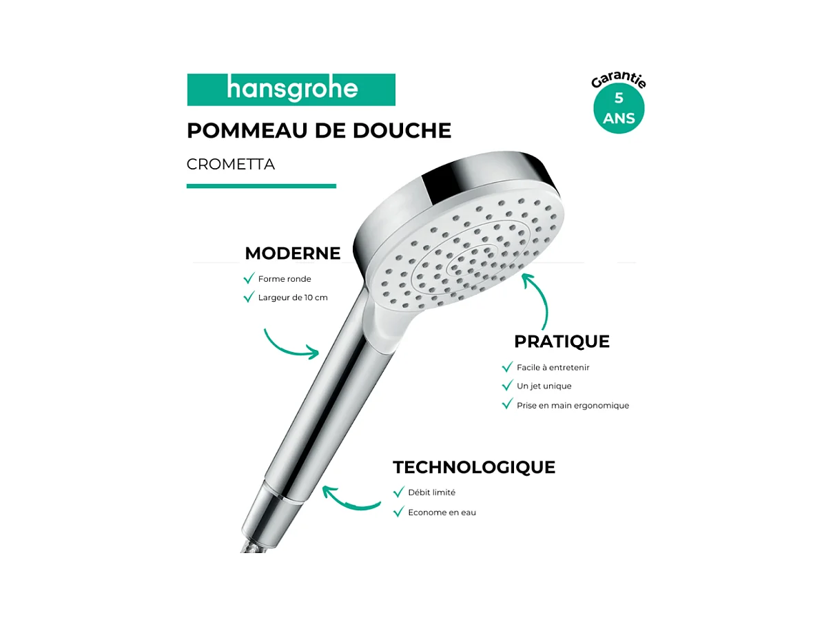 Pommeau de douche HANSGROHE Crometta EcoSmart blanc/chromé + flexible de douche 1,25 m HANSGROHE Metaflex chromé