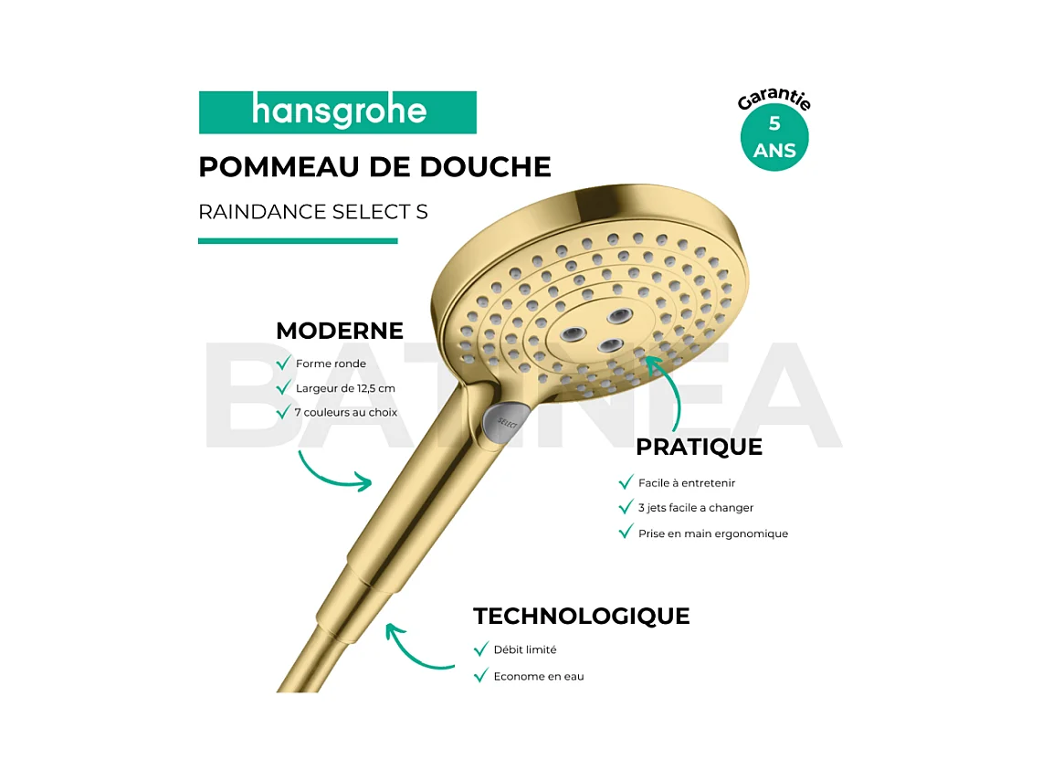 Pommeau de douche HANSGROHE Raindance Select S EcoSmart 120 3 jets aspect doré poli
