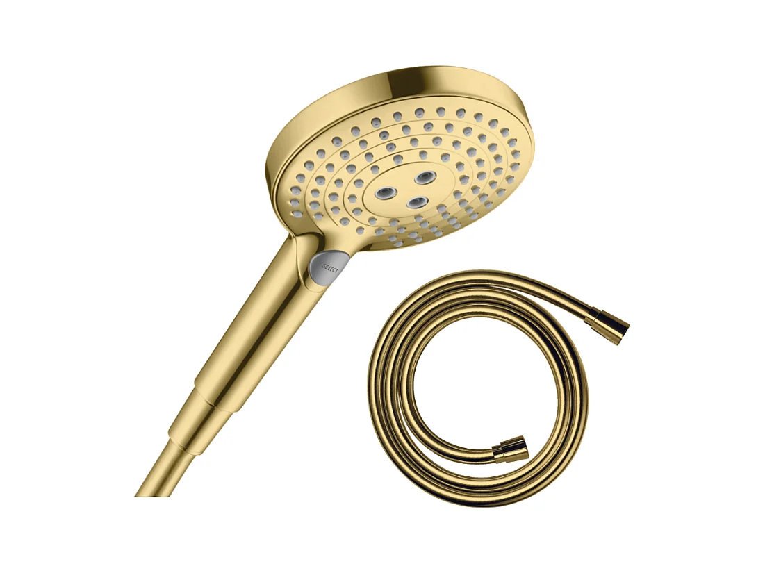 Pommeau de douche HANSGROHE Raindance Select S EcoSmart 120 3 jets + flexible HANSGROHE Designflex 200 cm aspect doré poli