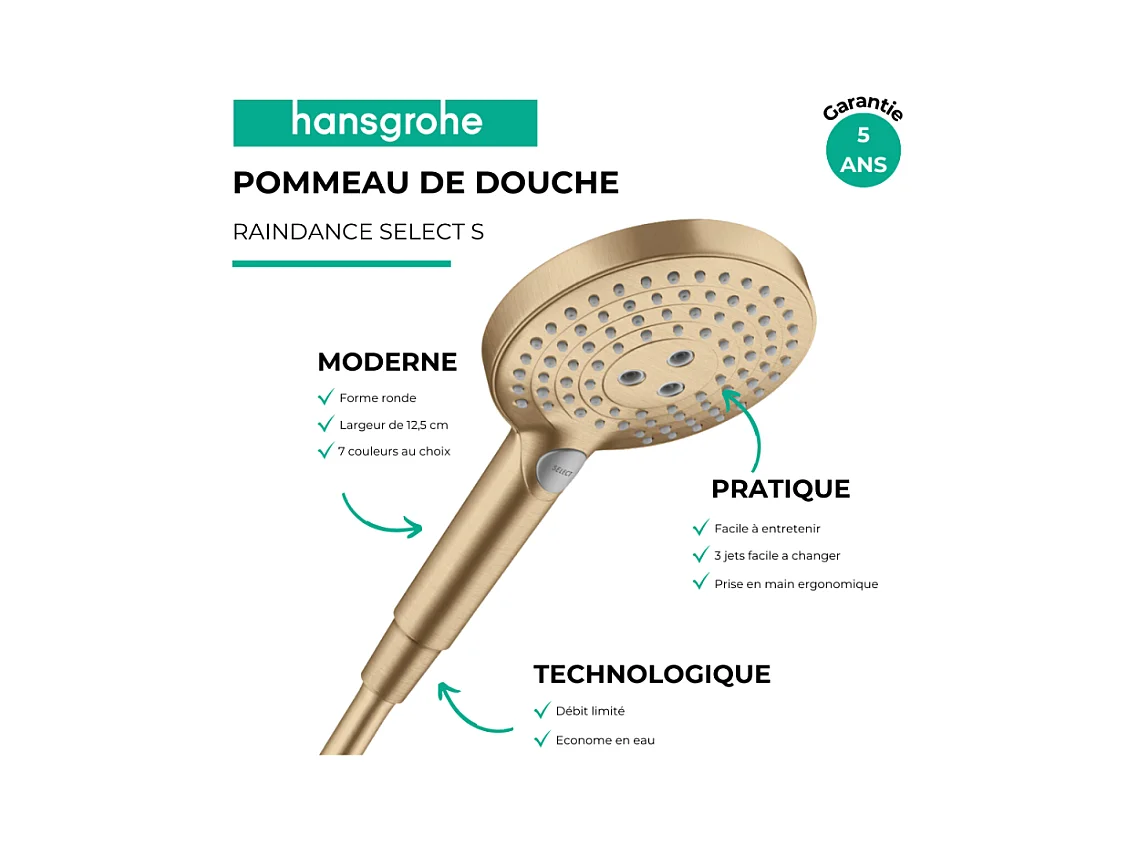 Pommeau de douche HANSGROHE Raindance Select S EcoSmart 120 3 jets aspect doré poli