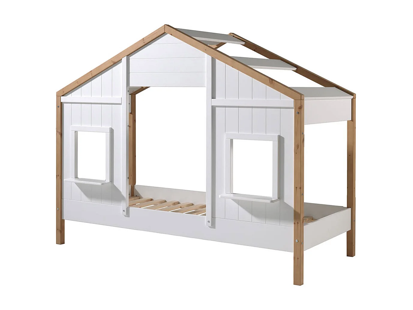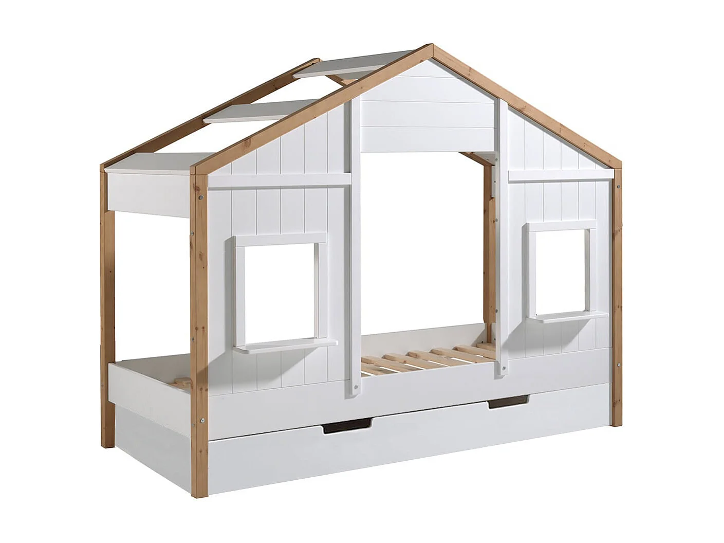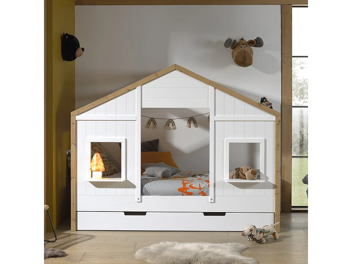 PONGO - Lit Maison 90x200cm Blanc et Pin à 2 Fenêtres + Tiroir