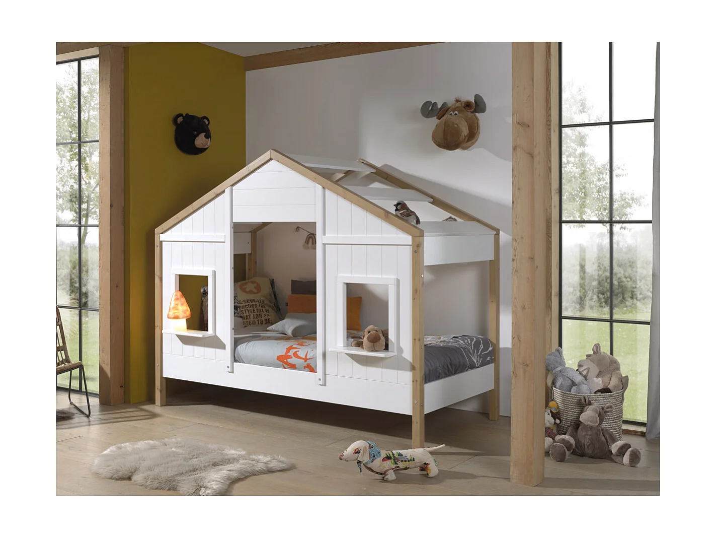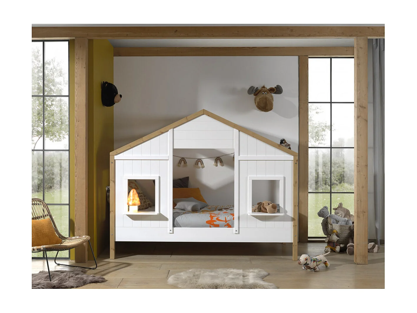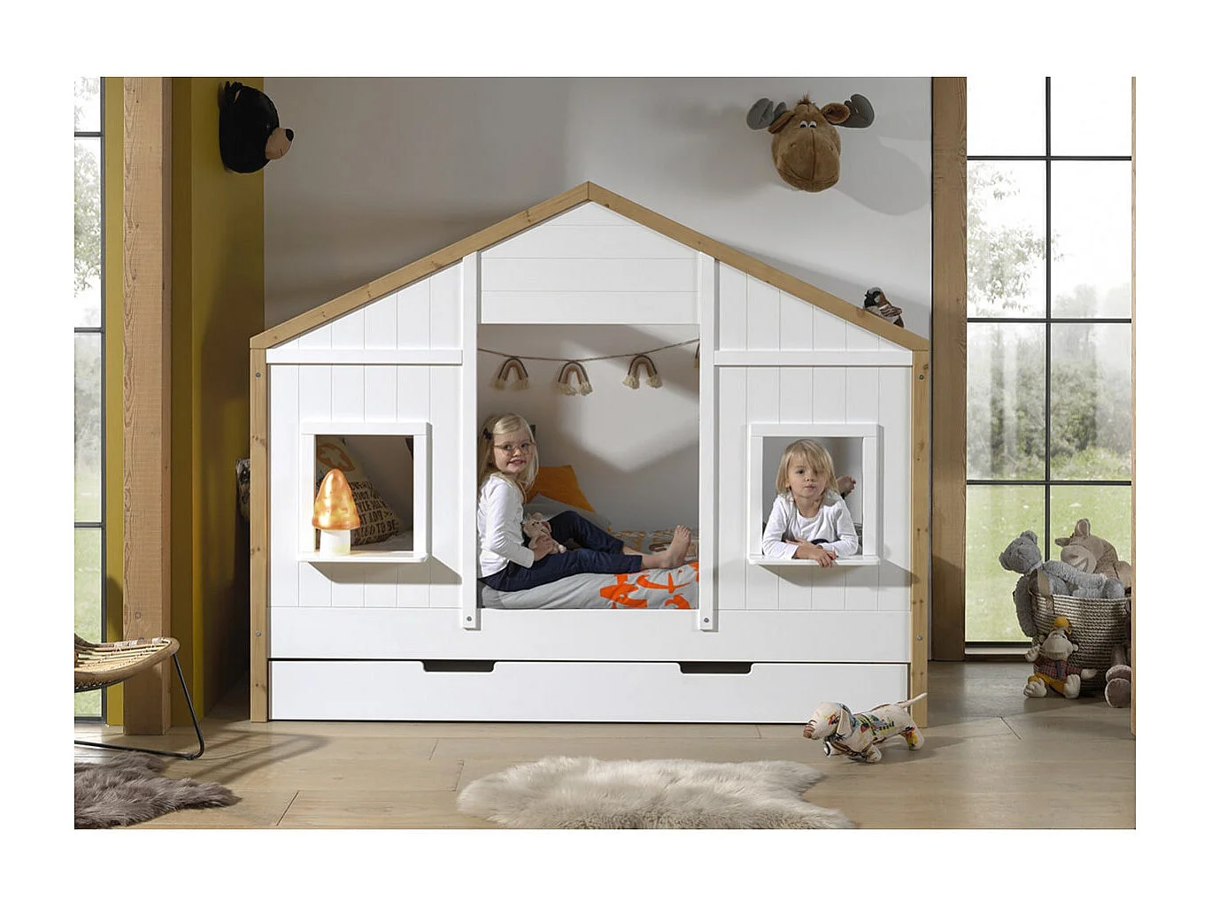 PONGO - Lit Maison 90x200cm Blanc et Pin à 2 Fenêtres + Tiroir