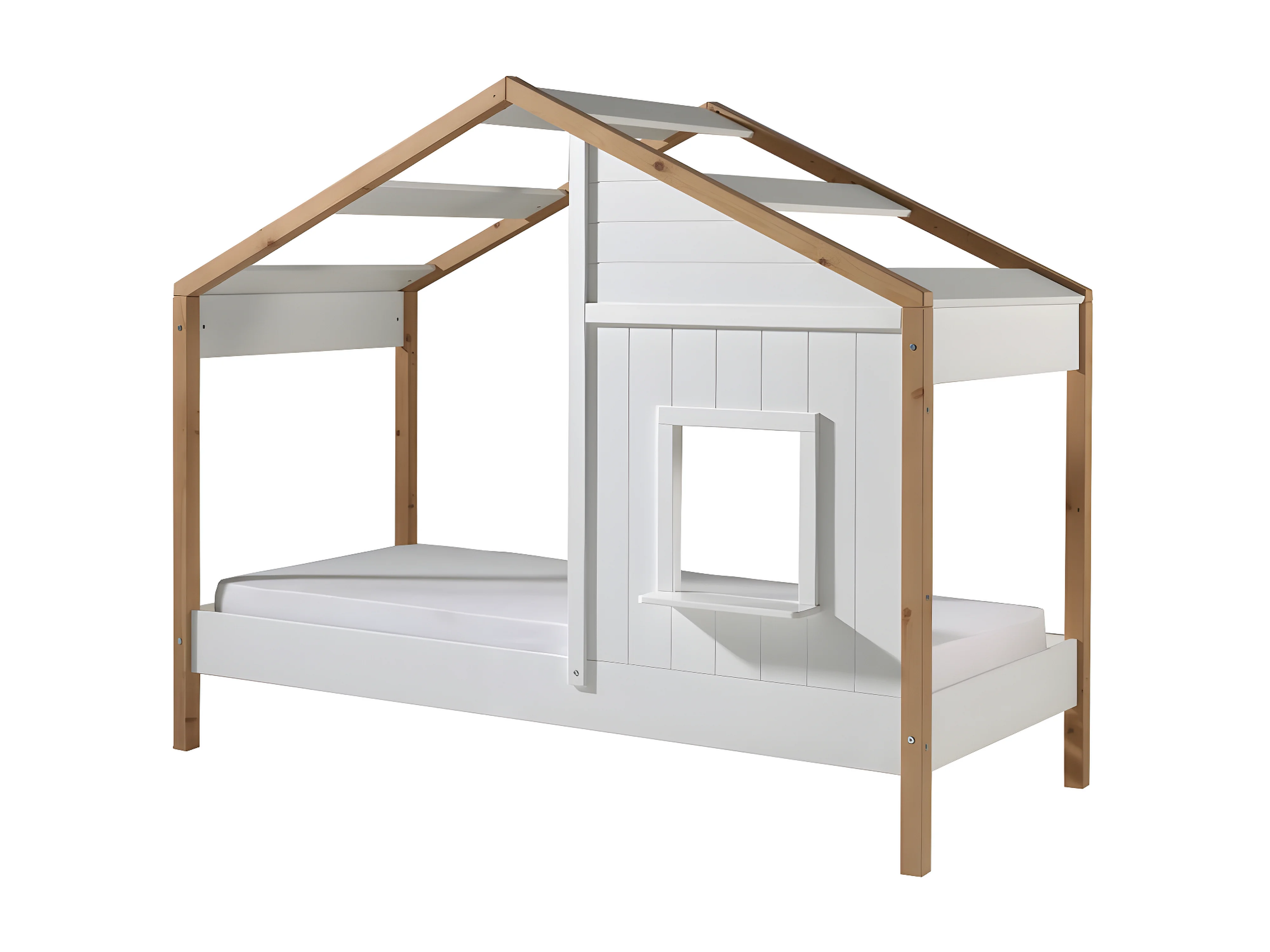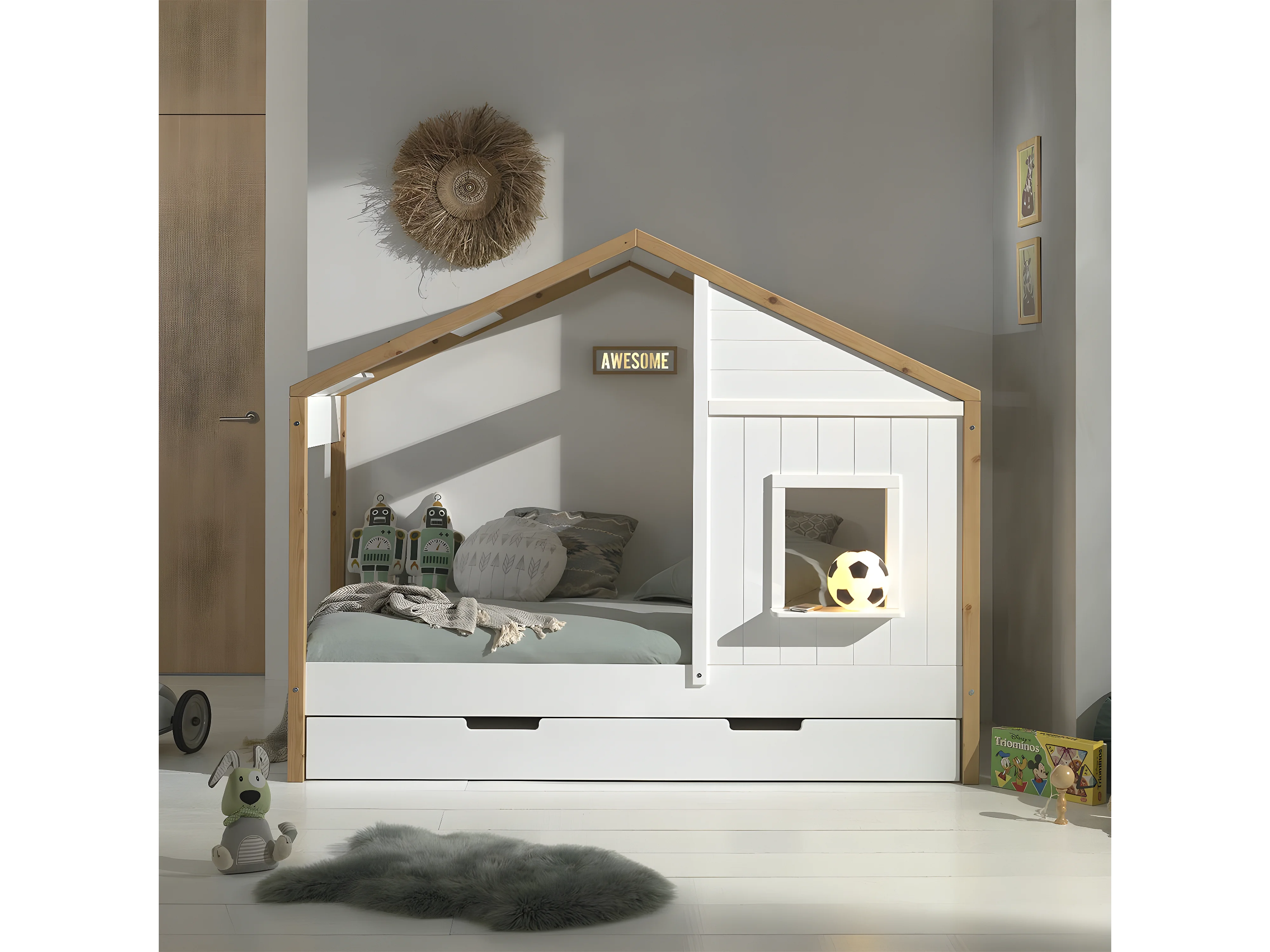 PONGO - Lit Maison 90x200cm Blanc et Pin avec Fenêtre + Tiroir