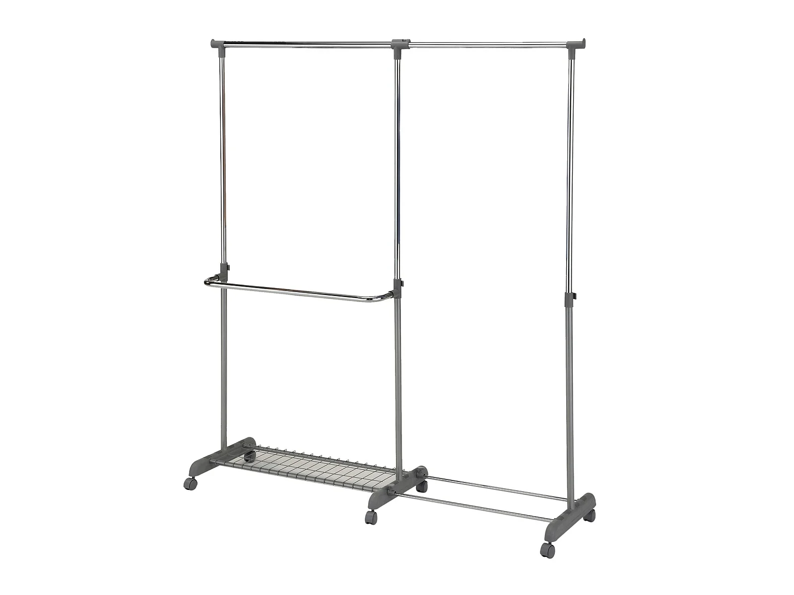 Portant à vêtements GROSSO penderie double sur roulettes vestiaire mobile 2 barres de hauteur réglable et 1 tablette, chromé et gris