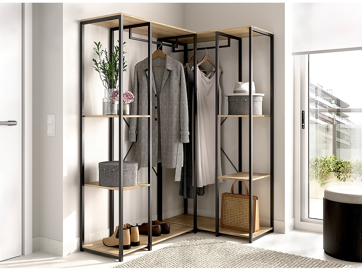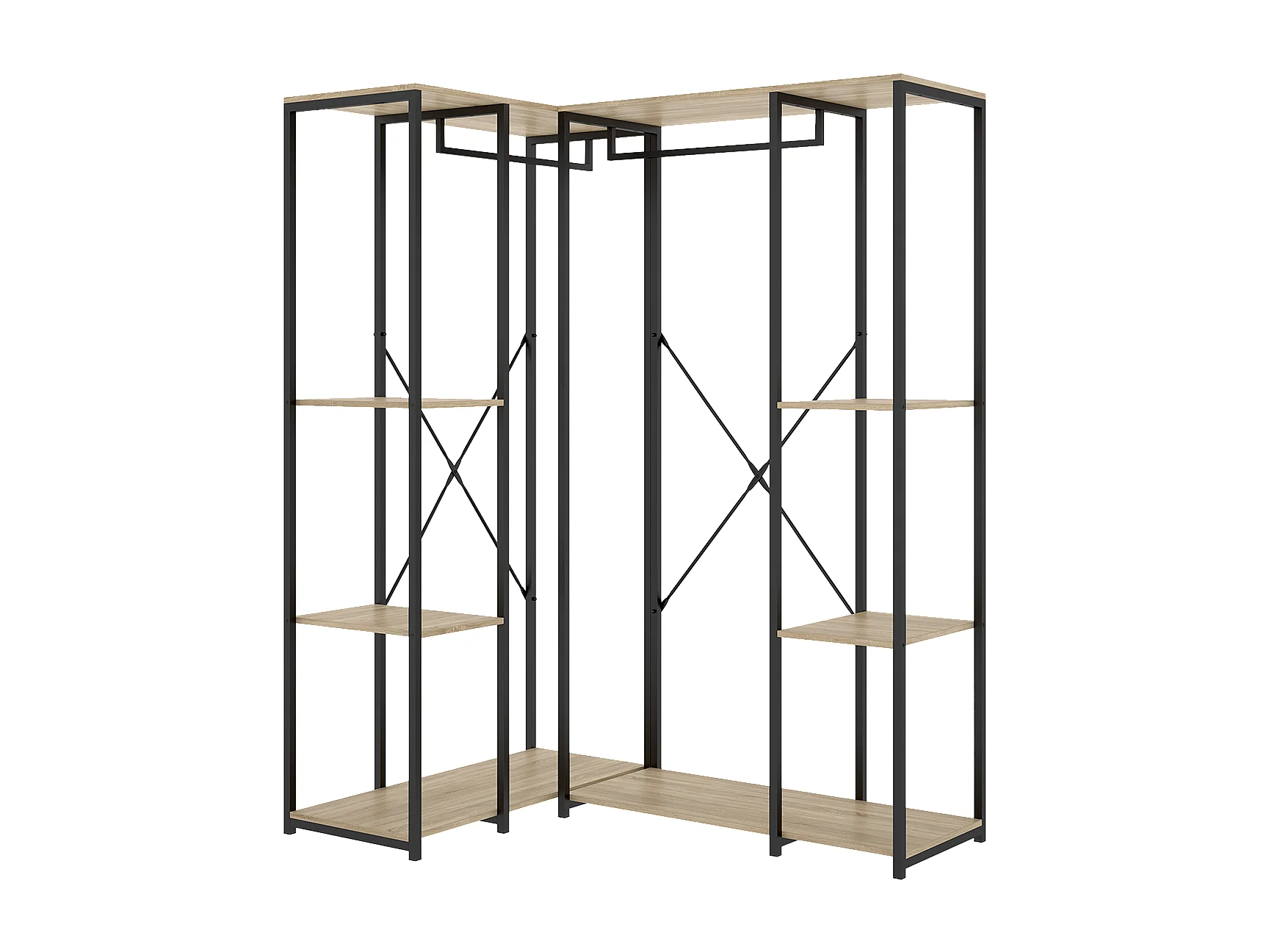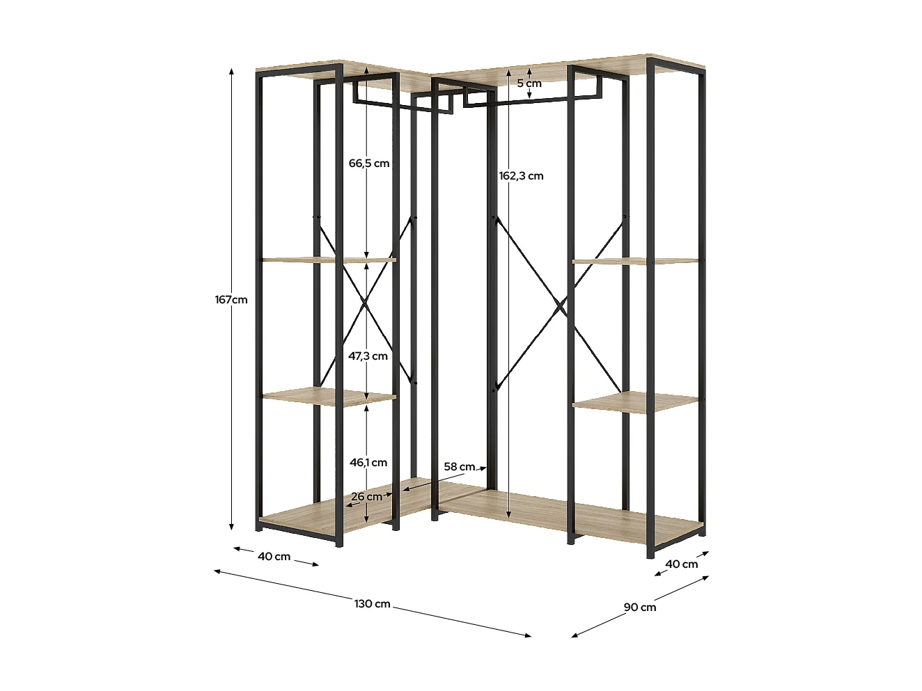 Portant à vêtements d'angle à double penderie de structure métallique avec 6 étagères de rangement, coloris naturel/noir