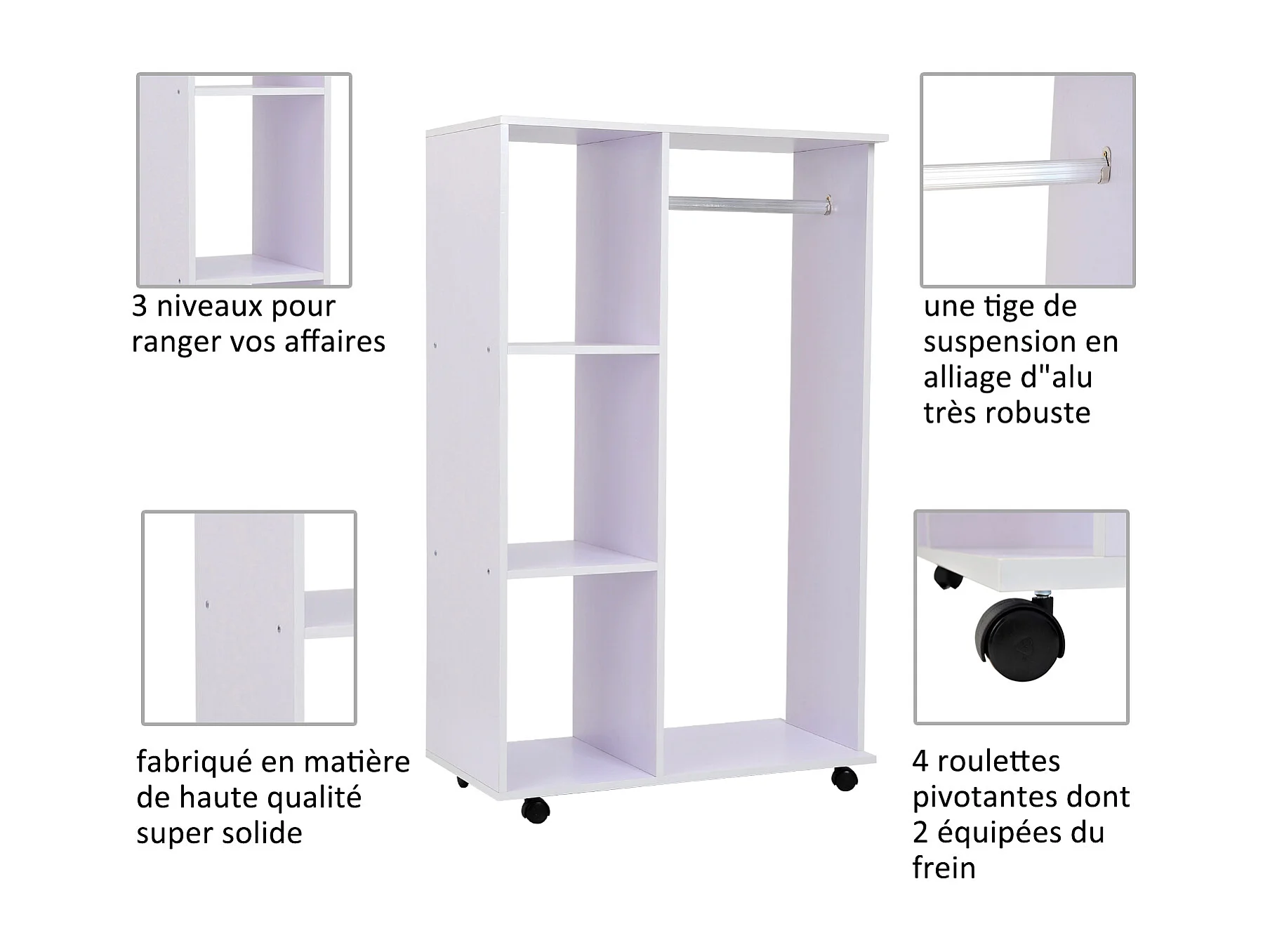 Portant à vêtements penderie mobile avec roulettes 3 étagères latérales + grand espace penderie panneaux particules blanc