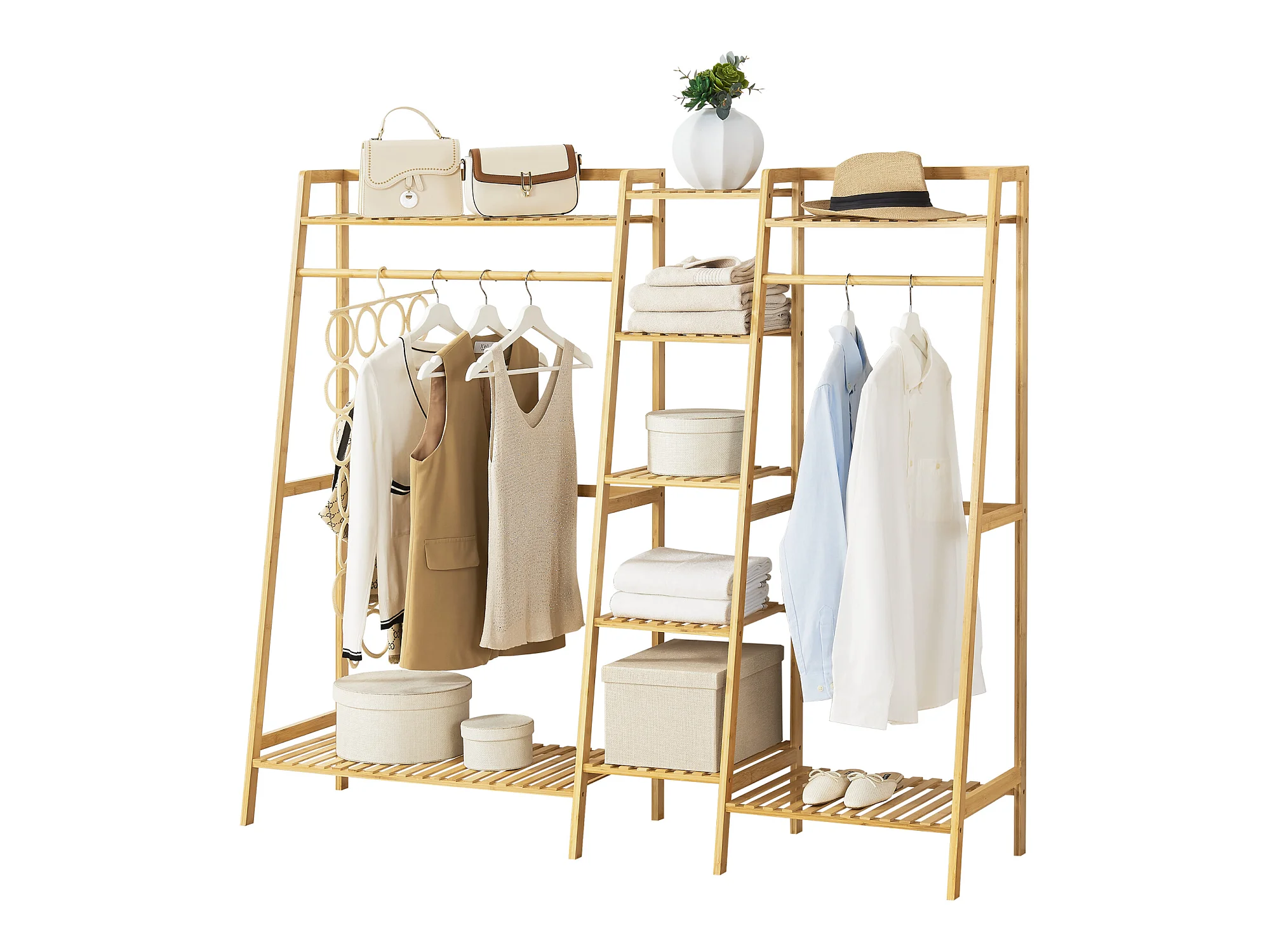 Porte-manteau en bambou avec 2 étagères, 2 crochets et 1 barre à vêtements, naturel (114x40x139 cm)