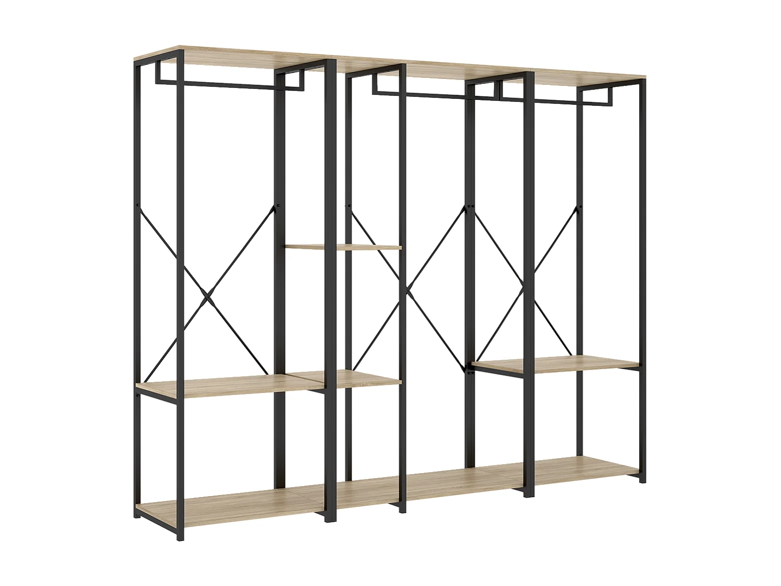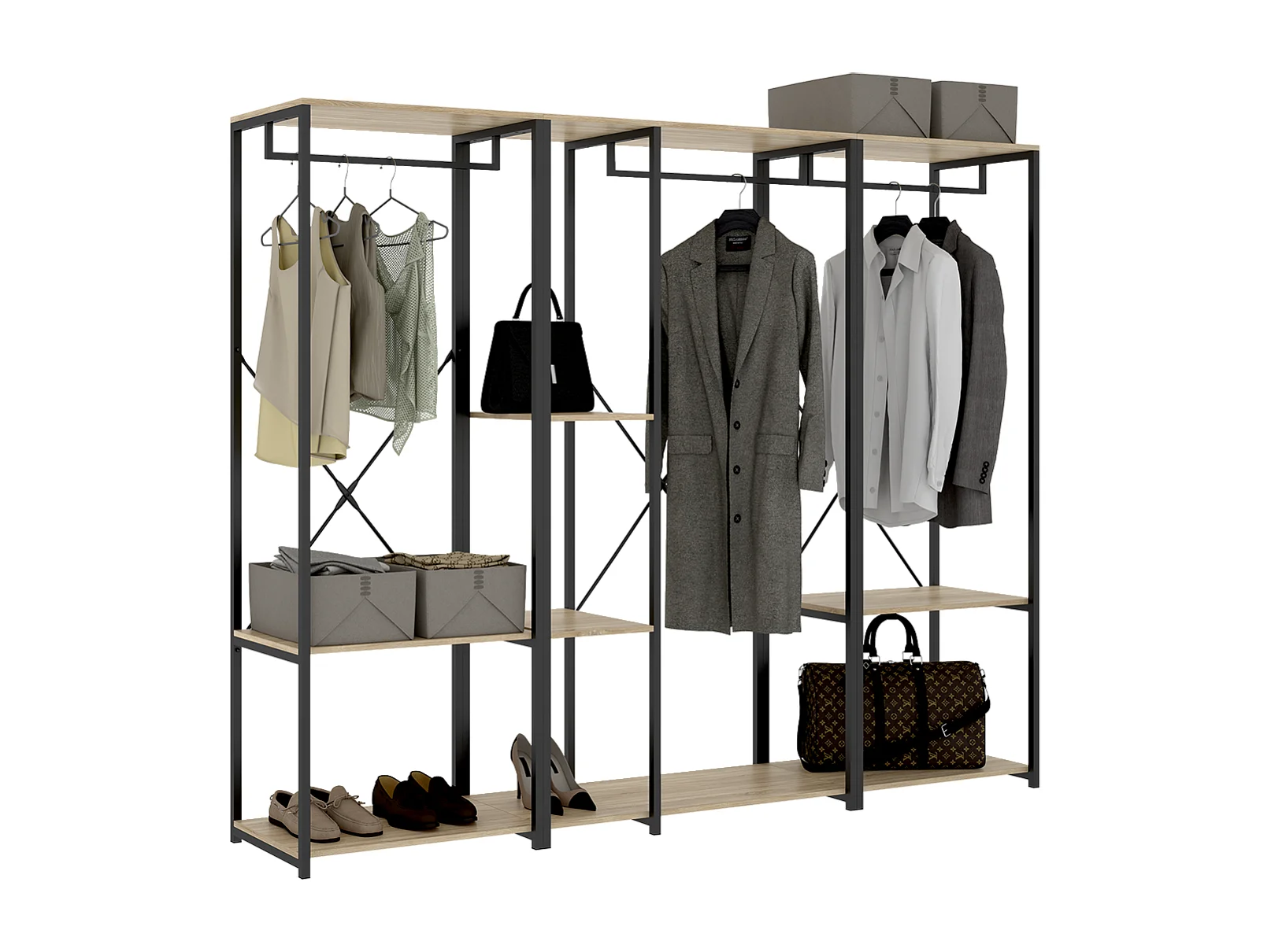 Portant à vêtements triple penderie de structure métallique avec 4 étagères de rangement, coloris naturel/noir - Hauteur 167 x Longueur 210 x Profondeur 40,4 cm