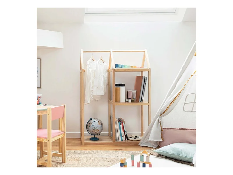 Penderie enfant DANILO avec tringle à vêtements et deux étagères, design tipi, en bois massif, coloris naturel/ blanc