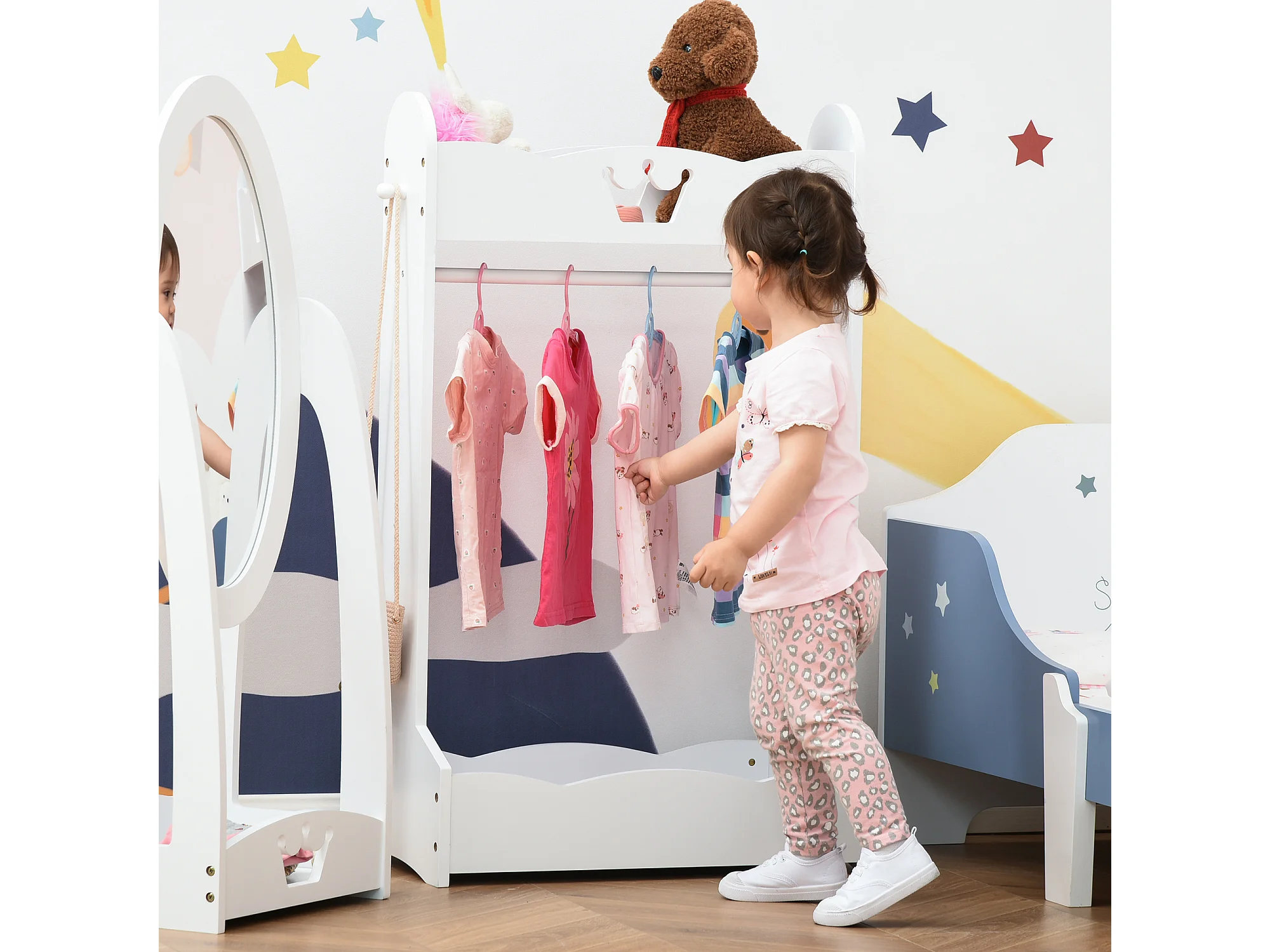 Portant enfant - penderie enfant - design couronne - 2 étagères de rangement, patère - dim. 63L x 37l x 103H cm - MDF pin blanc