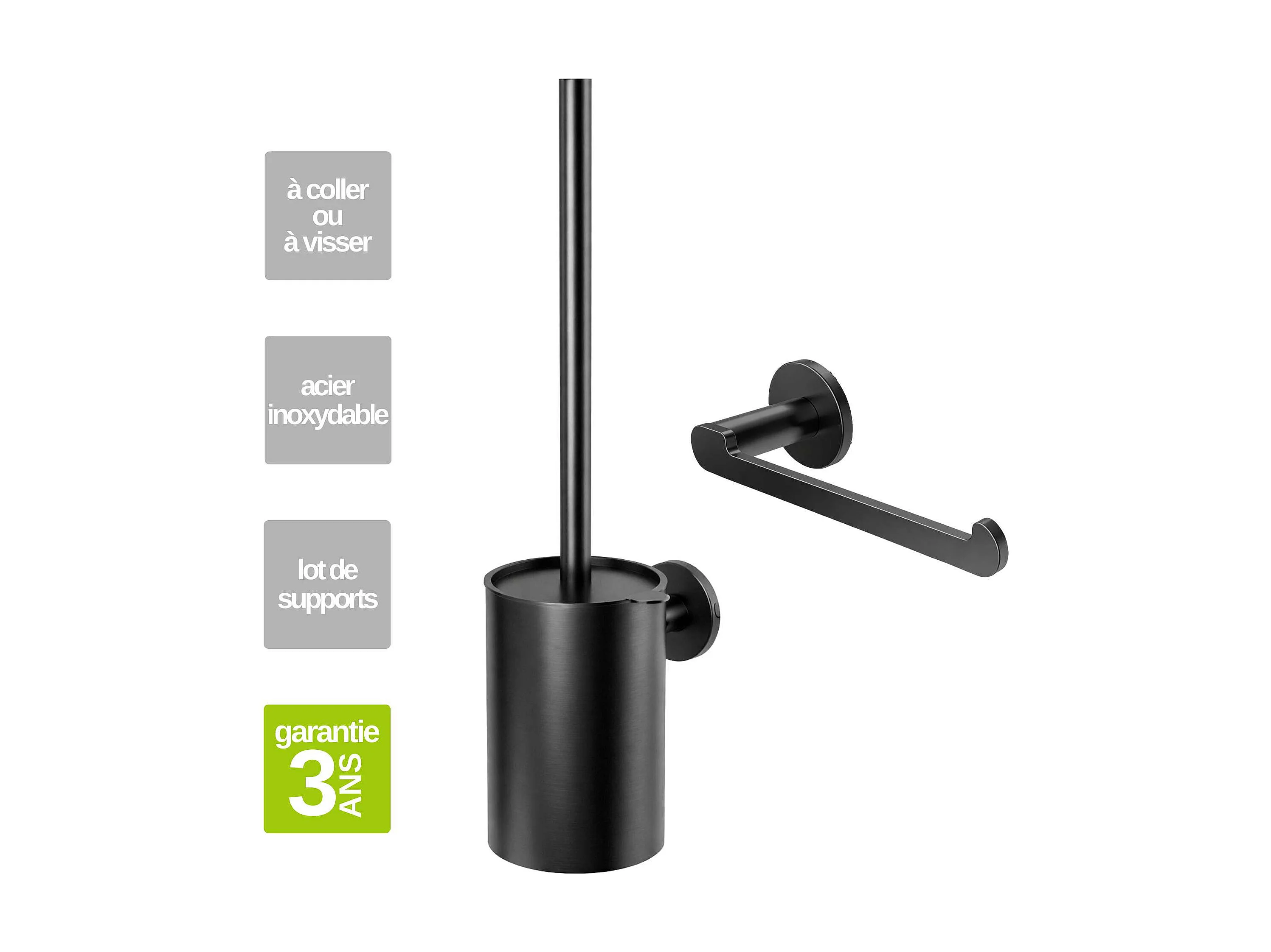 Porte-balai WC et Porte papier toilette - acier inoxydable S.304 gun métal - Fixation Collée ou Vissée